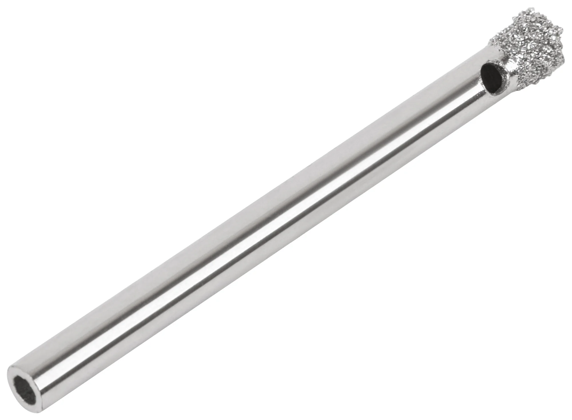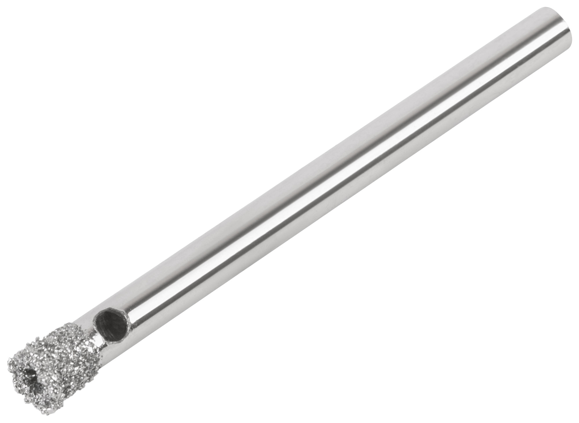 Коронка изготовлена из инструментальной стали с алмазным напылением на режущей кромке. Это позволяет эффективно сверлить твёрдые материалы. Цилиндрический хвостовик гарантирует надёжную фиксацию в патроне дрели.