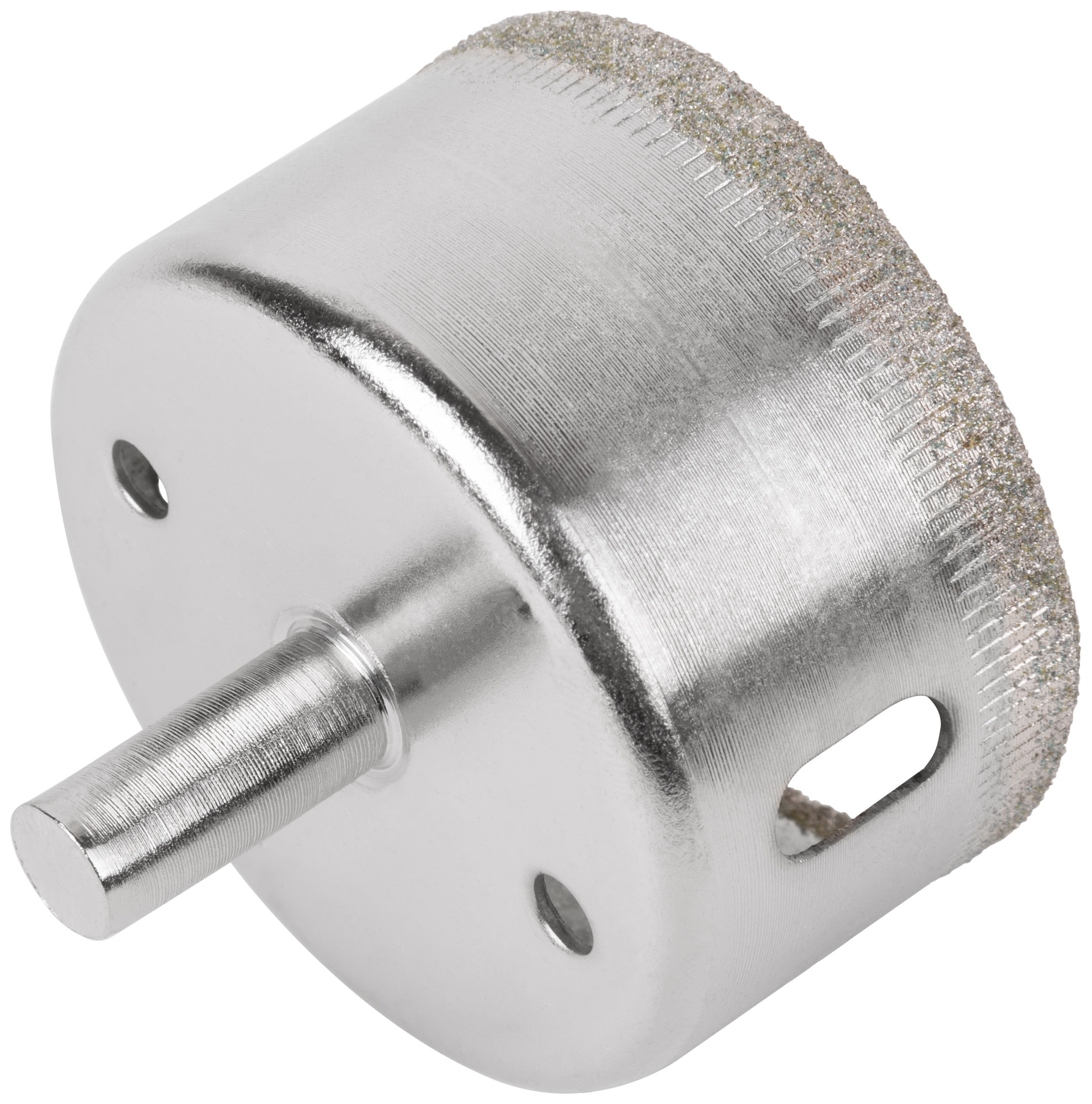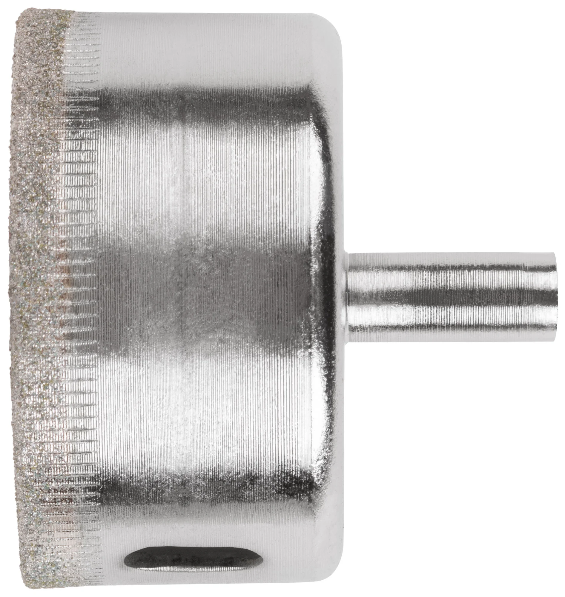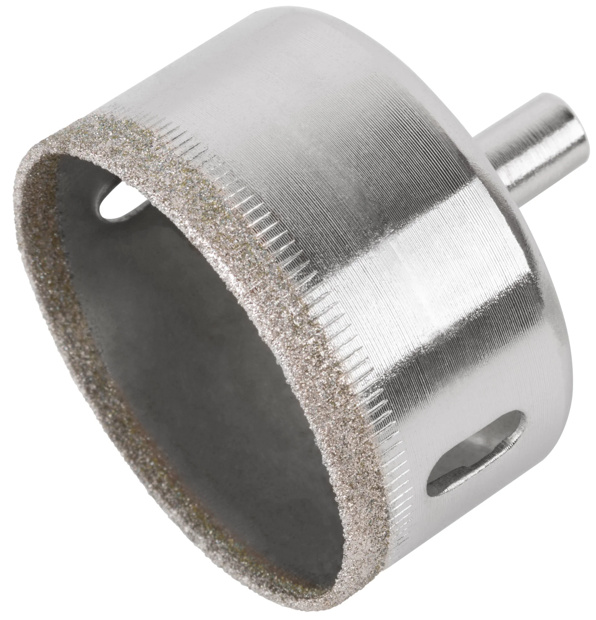 Коронка изготовлена из инструментальной стали с режущей кромкой, содержащей технические алмазы, что обеспечивает высокую износостойкость и длительный срок службы. Цилиндрический хвостовик упрощает установку и использование.