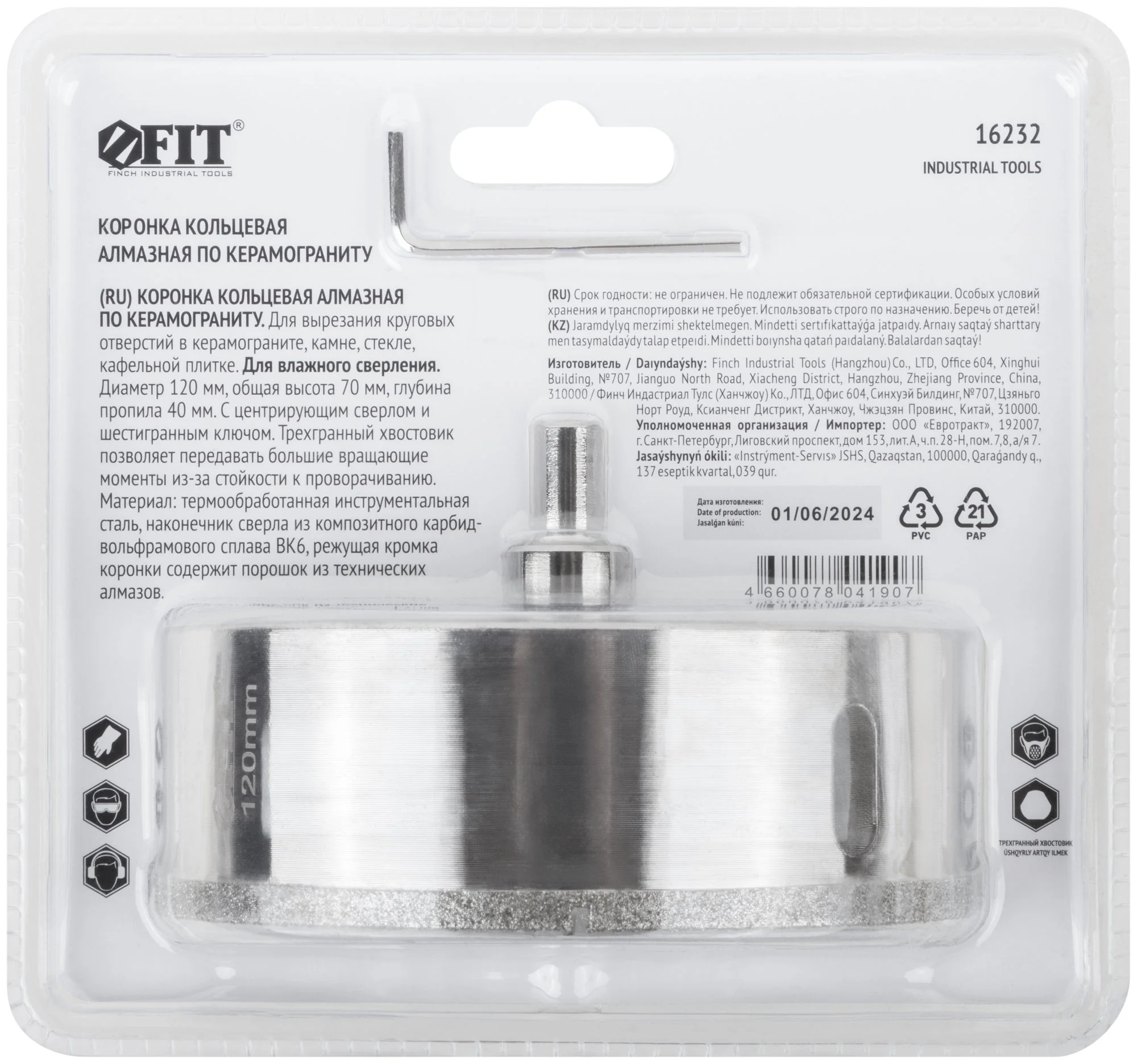 Изготовлена из инструментальной стали с алмазной кромкой, что обеспечивает долговечность и высокую производительность. В комплект входит центрирующее сверло, что позволяет легко и точно начинать сверление.