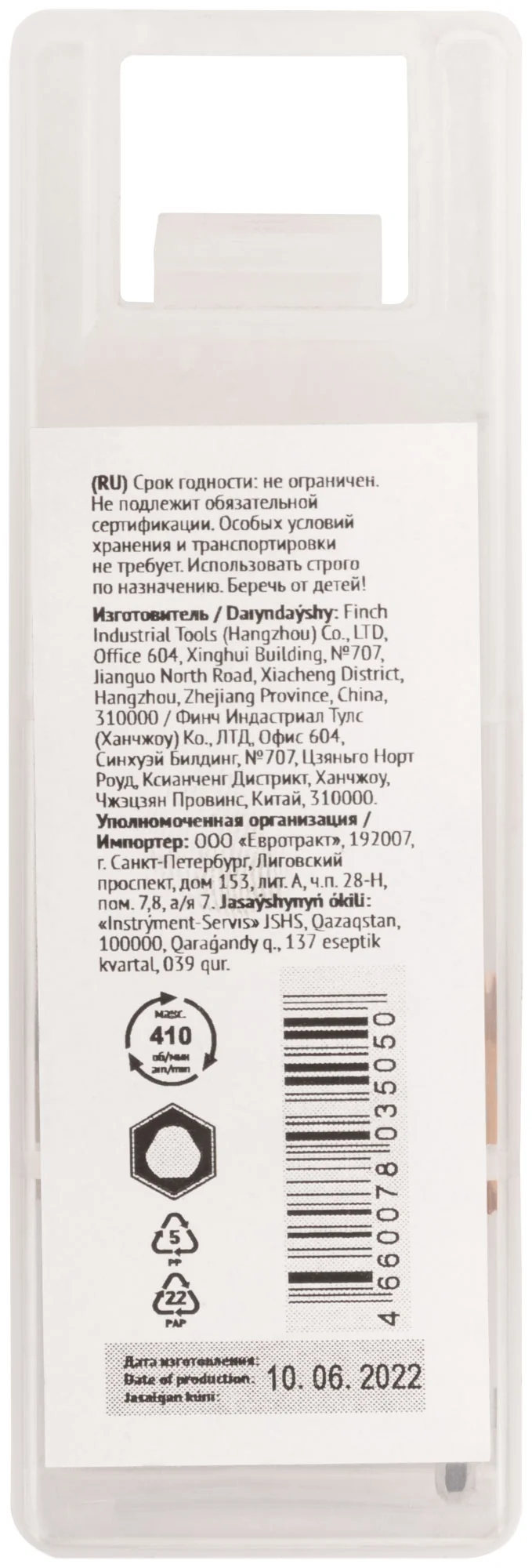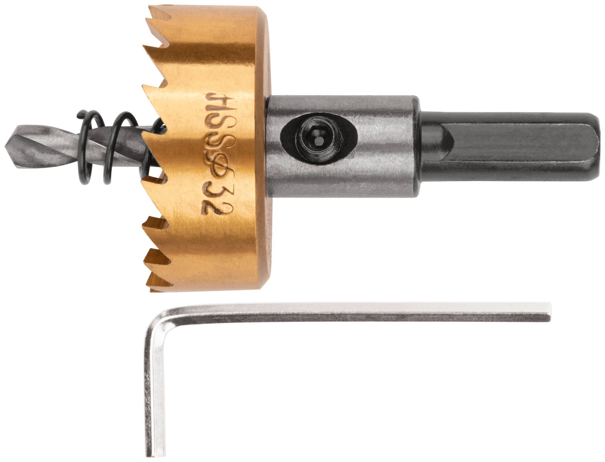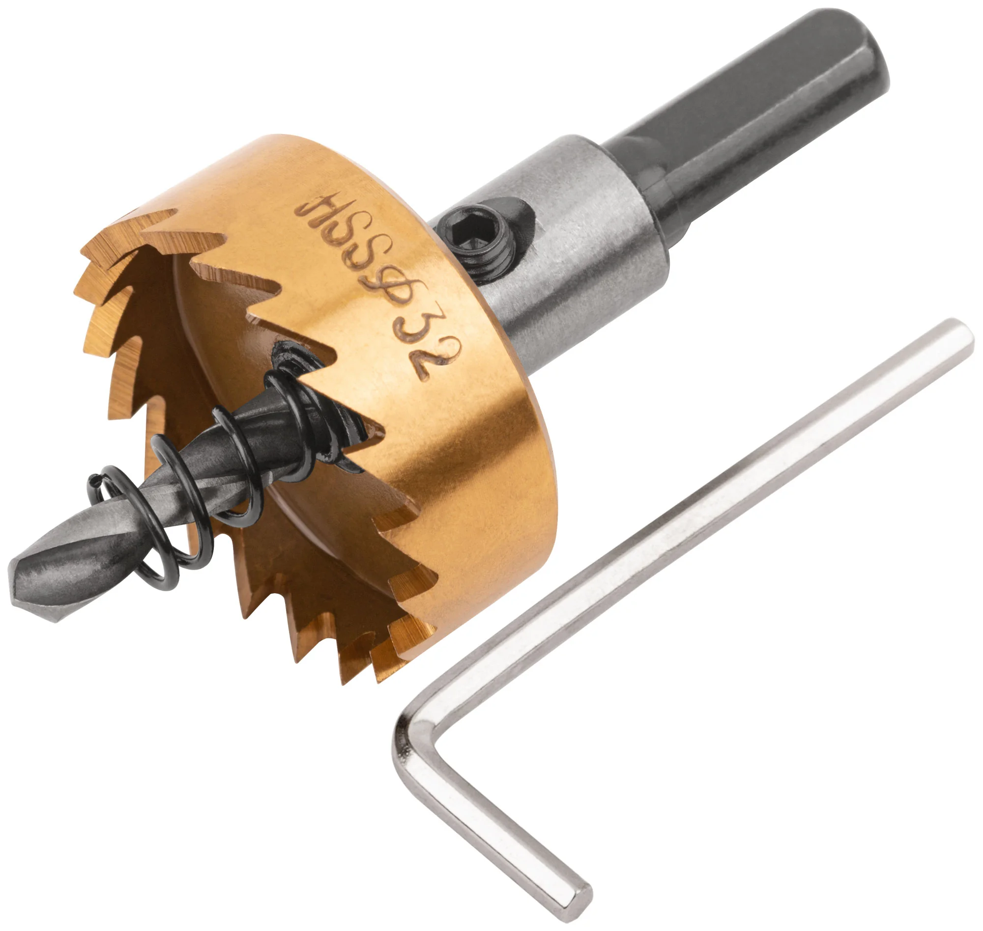Изготовлена из быстрорежущей стали (HSS) с титановым покрытием, что обеспечивает высокую износостойкость и долговечность. Центрирующее сверло также выполнено из HSS стали, а хвостовик изготовлен из инструментальной стали, что гарантирует устойчивость к нагрузкам.