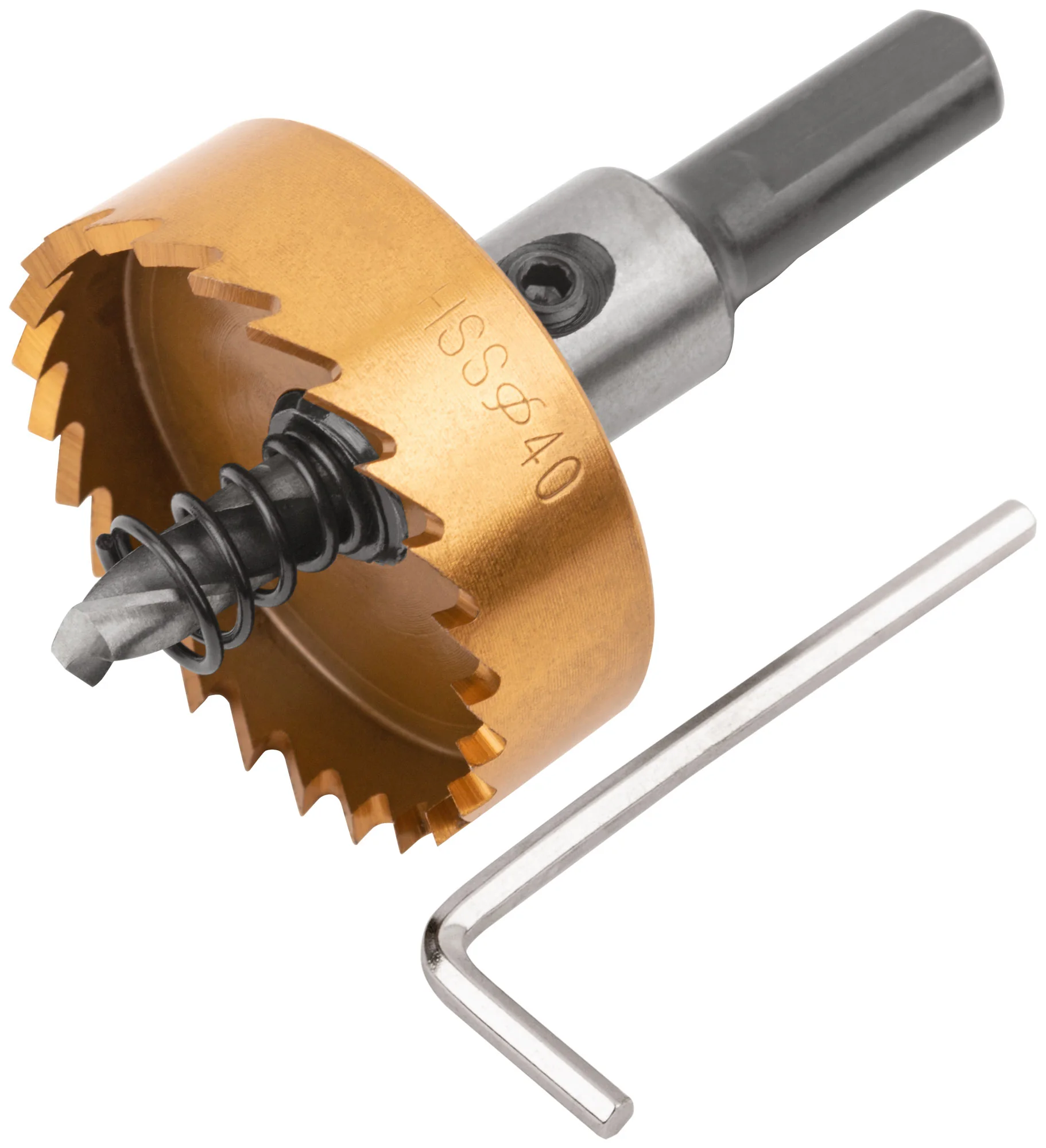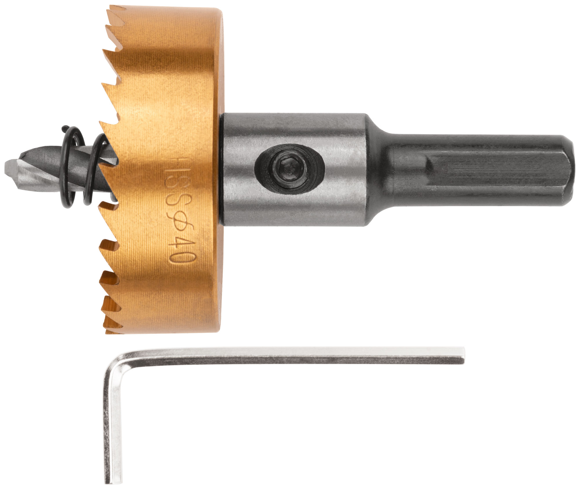 Коронка изготовлена из быстрорежущей стали (HSS) с титановым покрытием, что значительно увеличивает её износостойкость и срок службы. Центрирующее сверло и хвостовик из инструментальной стали обеспечивают точное позиционирование и надежное крепление в инструменте.