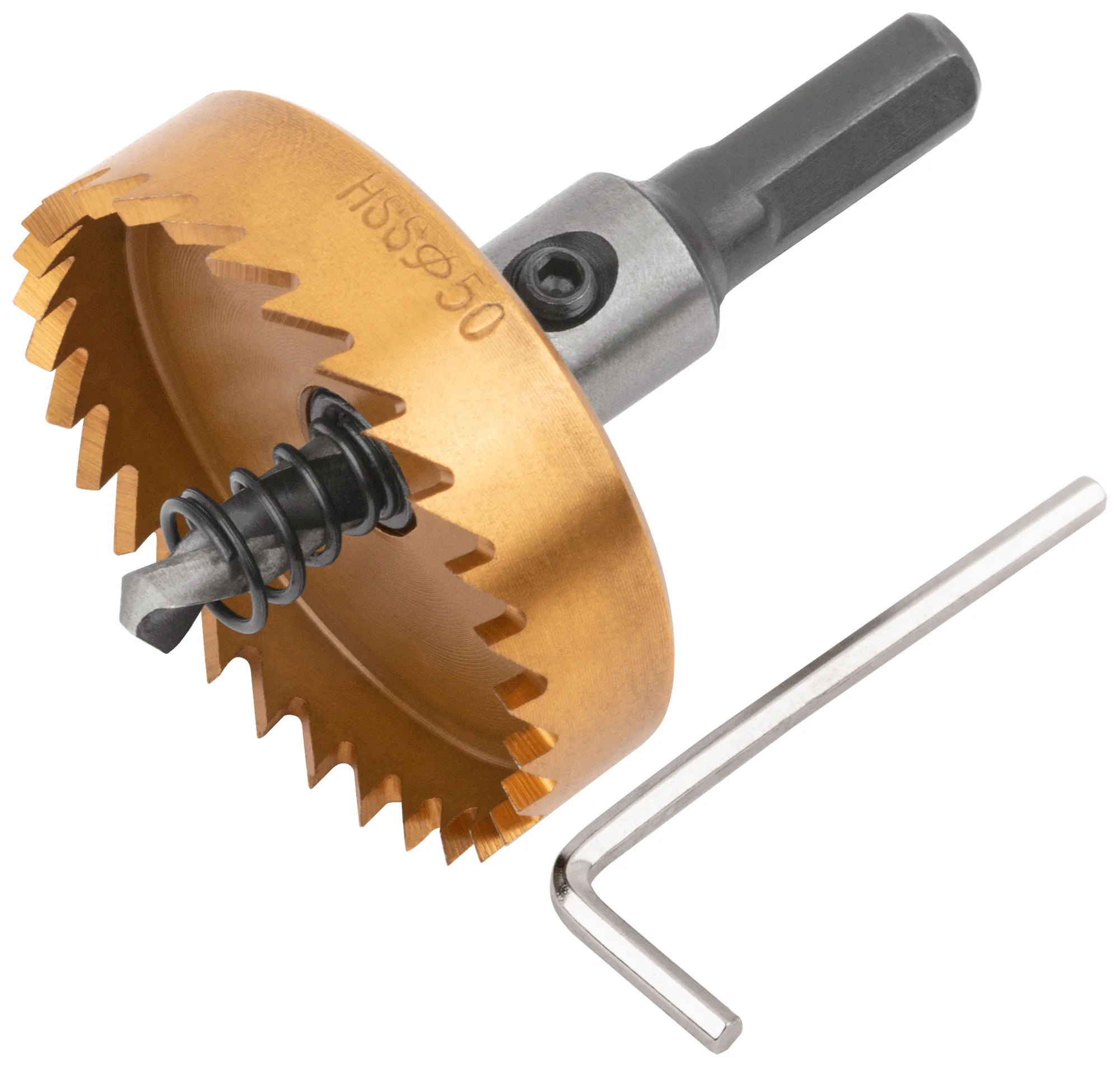 Конструкция коронки включает центрирующее сверло и режущую часть из быстрорежущей стали (HSS) с титановым покрытием, что обеспечивает высокую производительность и долговечность. Трехгранный хвостовик выполнен из инструментальной стали для надежной фиксации в патроне.
