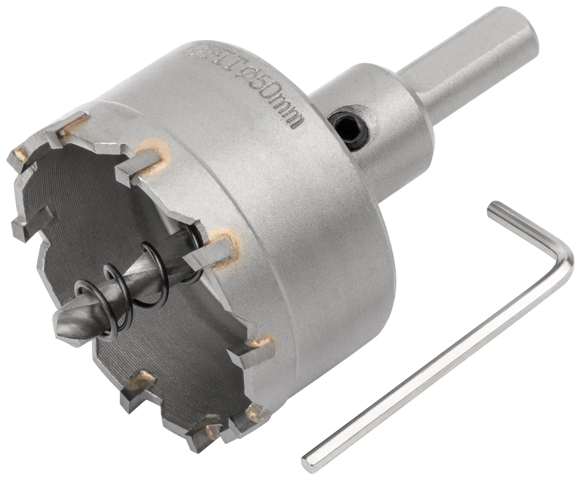 Изготовлена из инструментальной стали с усилением карбидными вставками, коронка обеспечивает высокую прочность и долговечность. Ее размер 50 мм позволяет быстро и точно сверлить отверстия нужного диаметра.