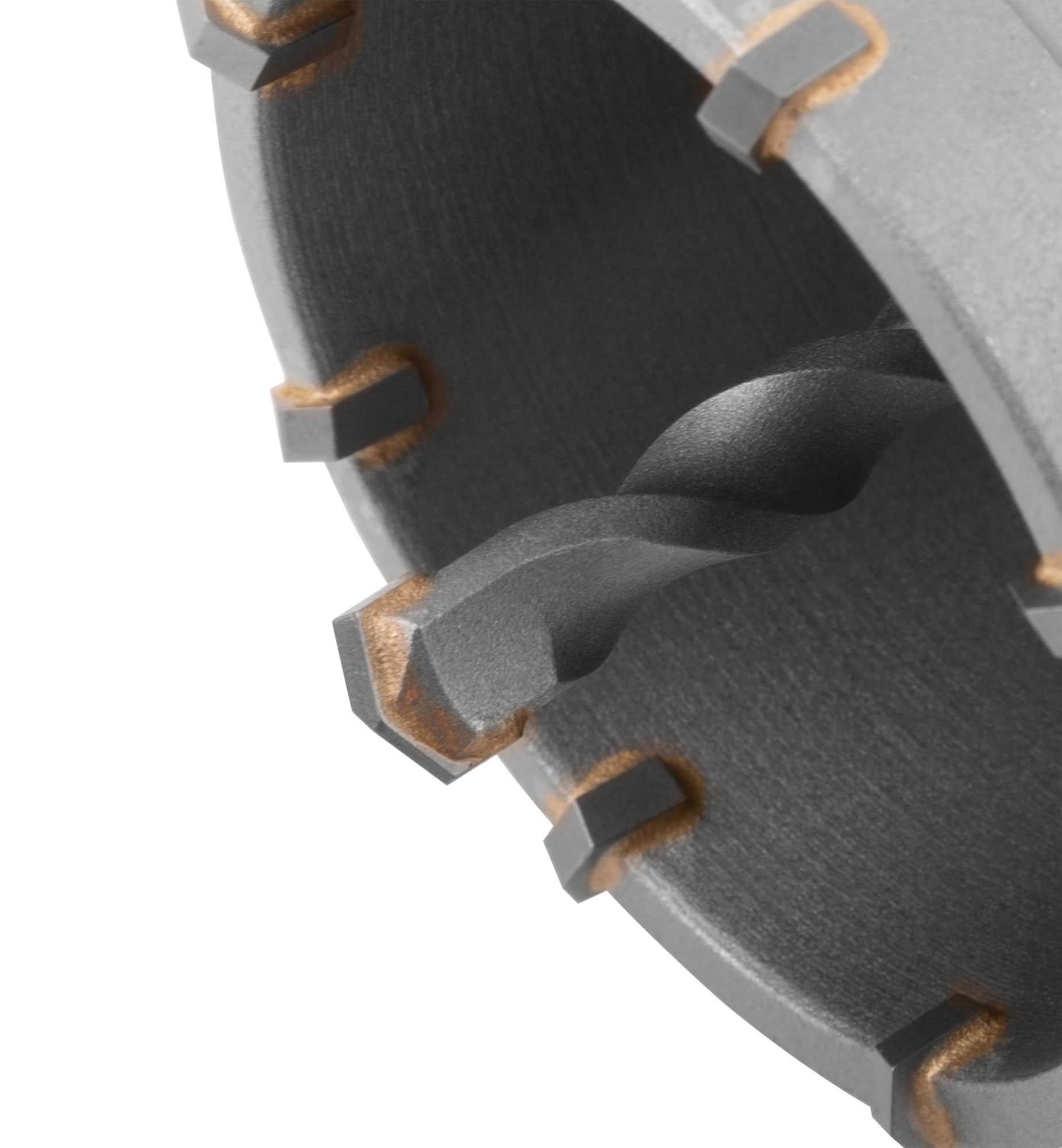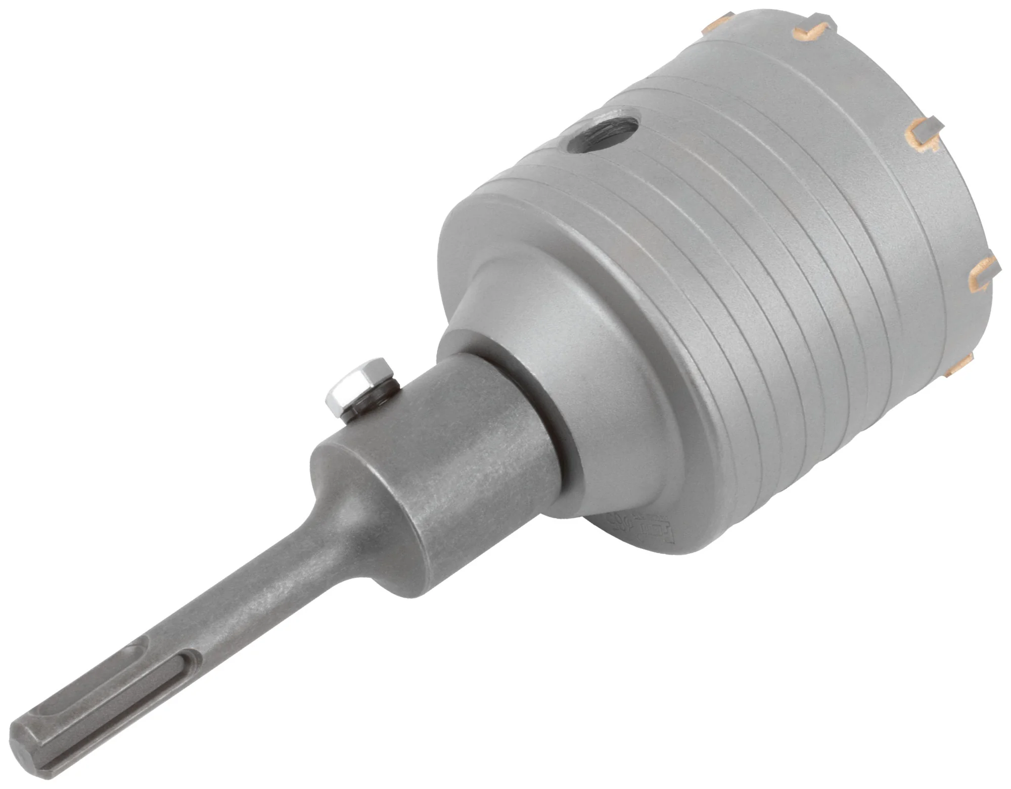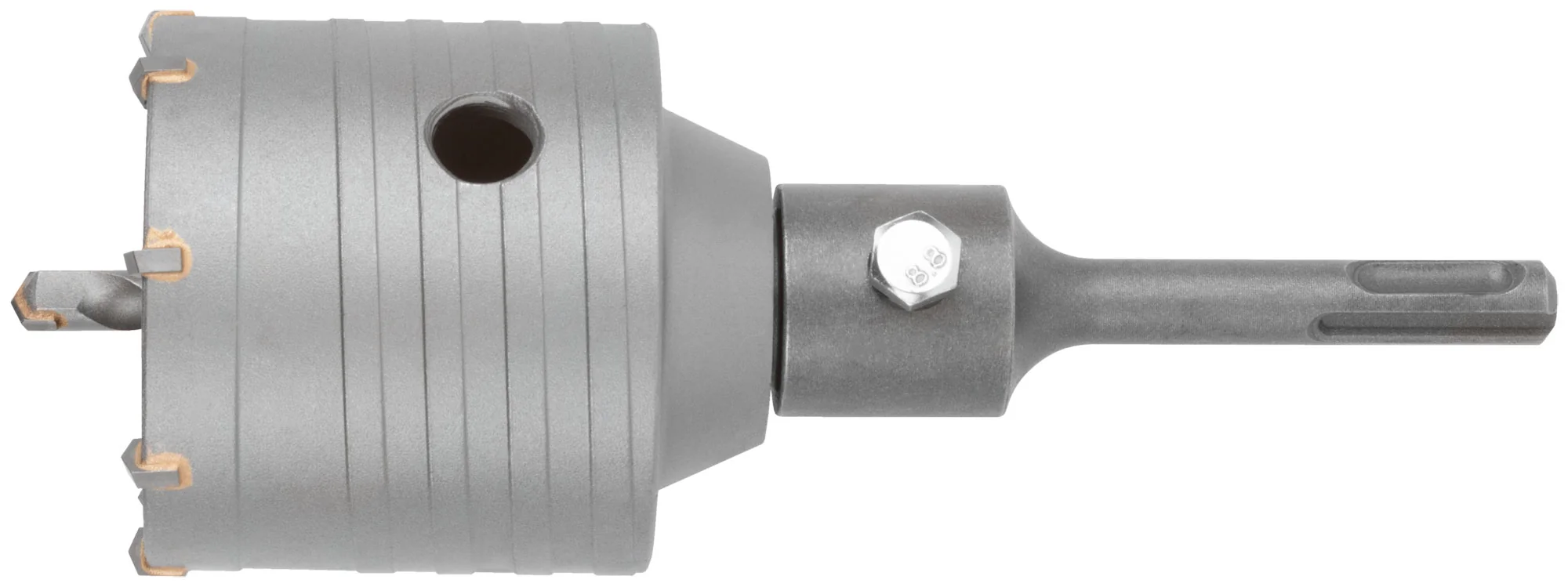 Коронка изготовлена из хром-молибденовой стали с карбидной вставкой, что обеспечивает её долговечность и высокую износостойкость. SDS-Plus хвостовик длиной 100 мм обеспечивает надёжное крепление и лёгкость в эксплуатации.