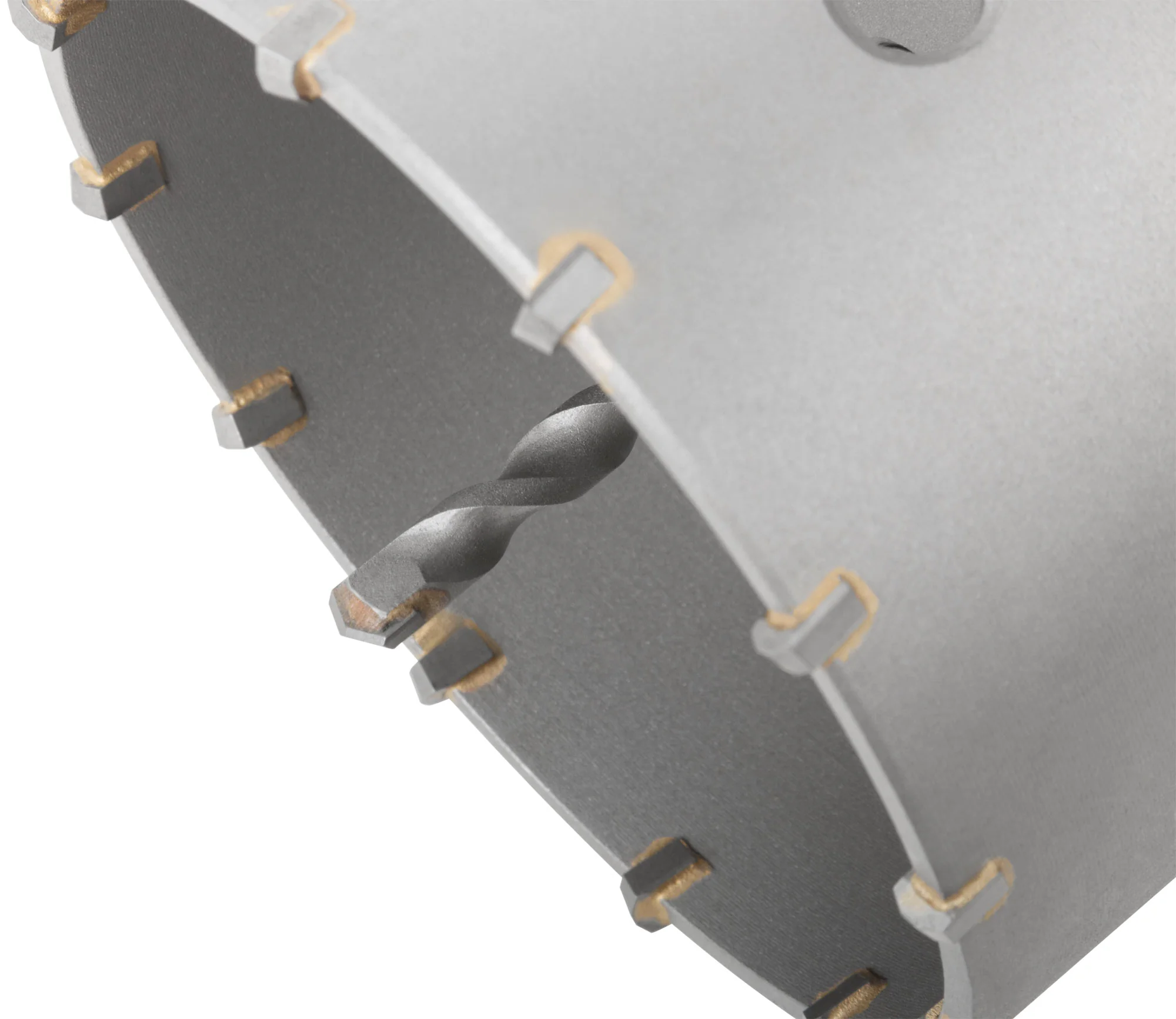 Изготовленная из инструментальной стали, коронка оснащена твердосплавными резцами с добавлением карбида вольфрама, что обеспечивает высокую износостойкость и долговечность. Центральное сверло с твердосплавным наконечником гарантирует точность и эффективность работы. Посадочное отверстие коронки — М22, что обеспечивает надежное крепление.