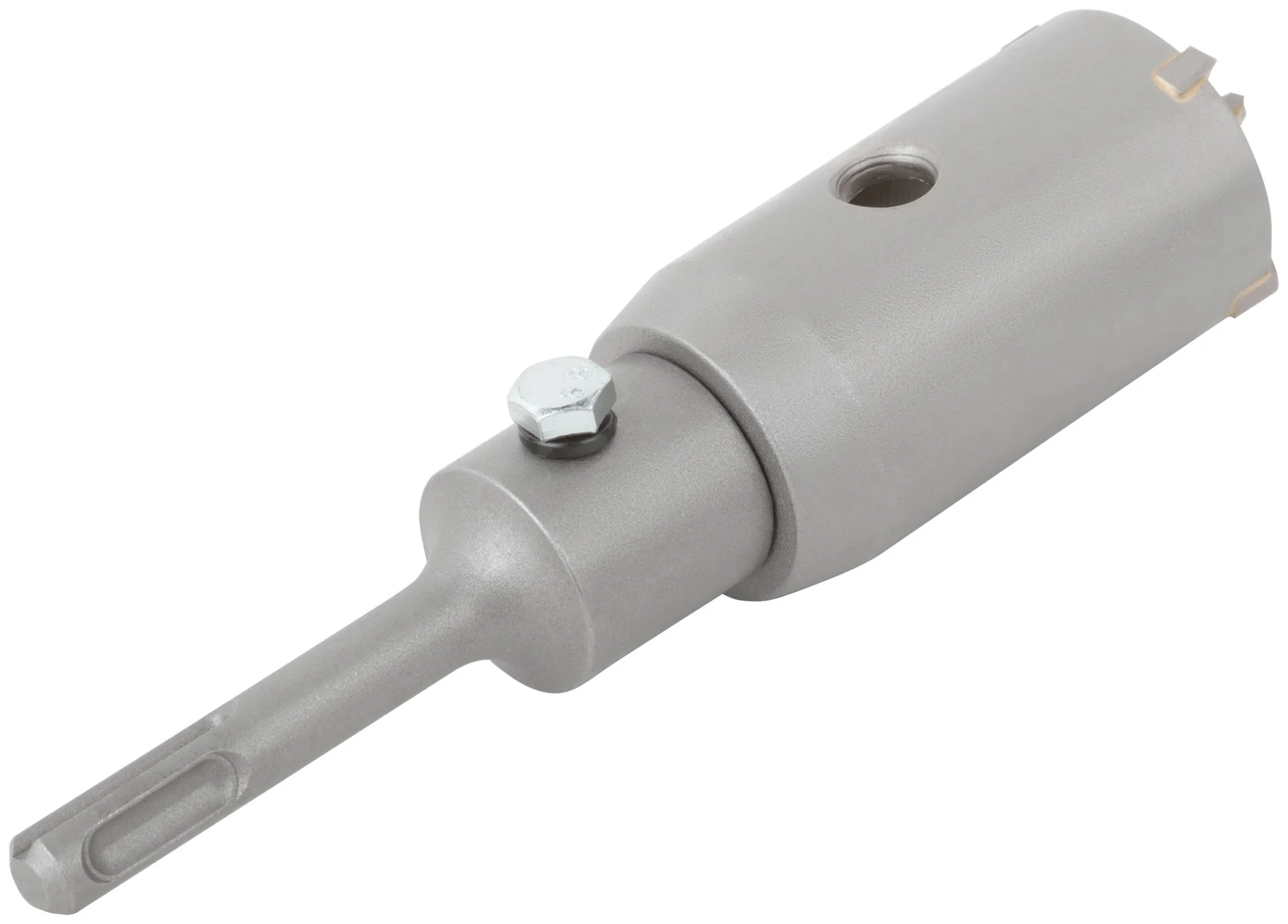 Коронка оснащена твердосплавными резцами с добавлением карбида вольфрама и сверлом для центрования с твердосплавным наконечником. Посадочное отверстие составляет M22, а тип хвостовика — SDS-Plus.