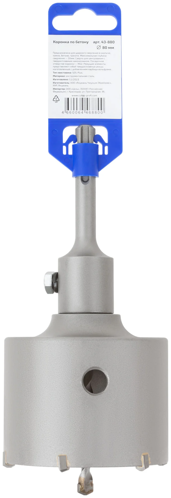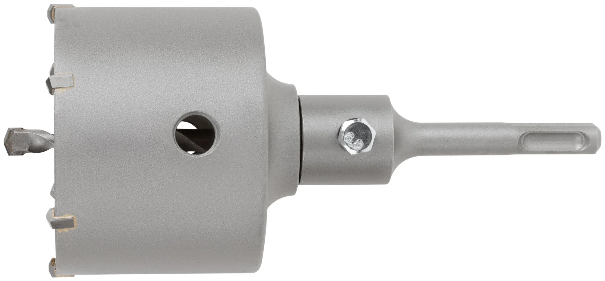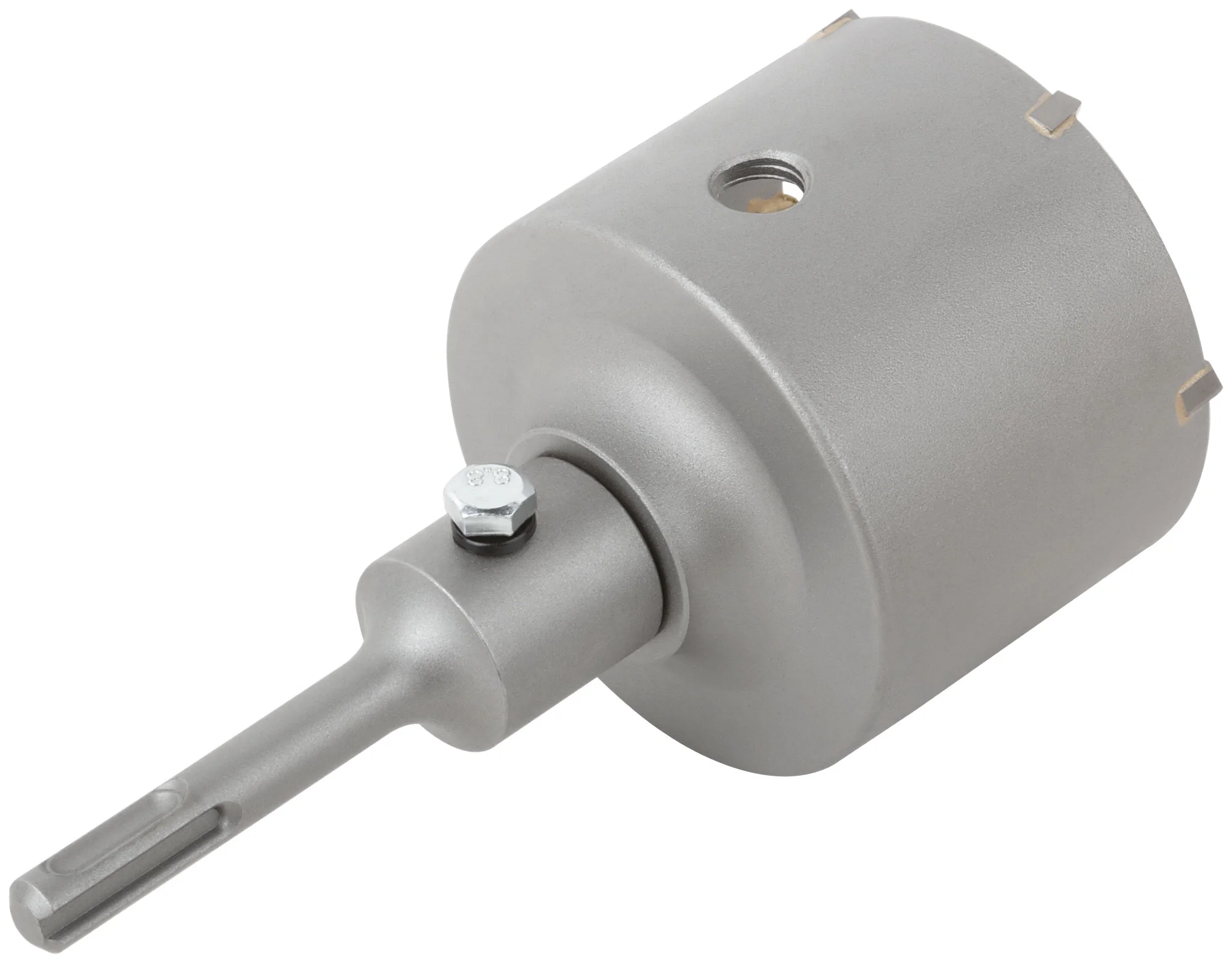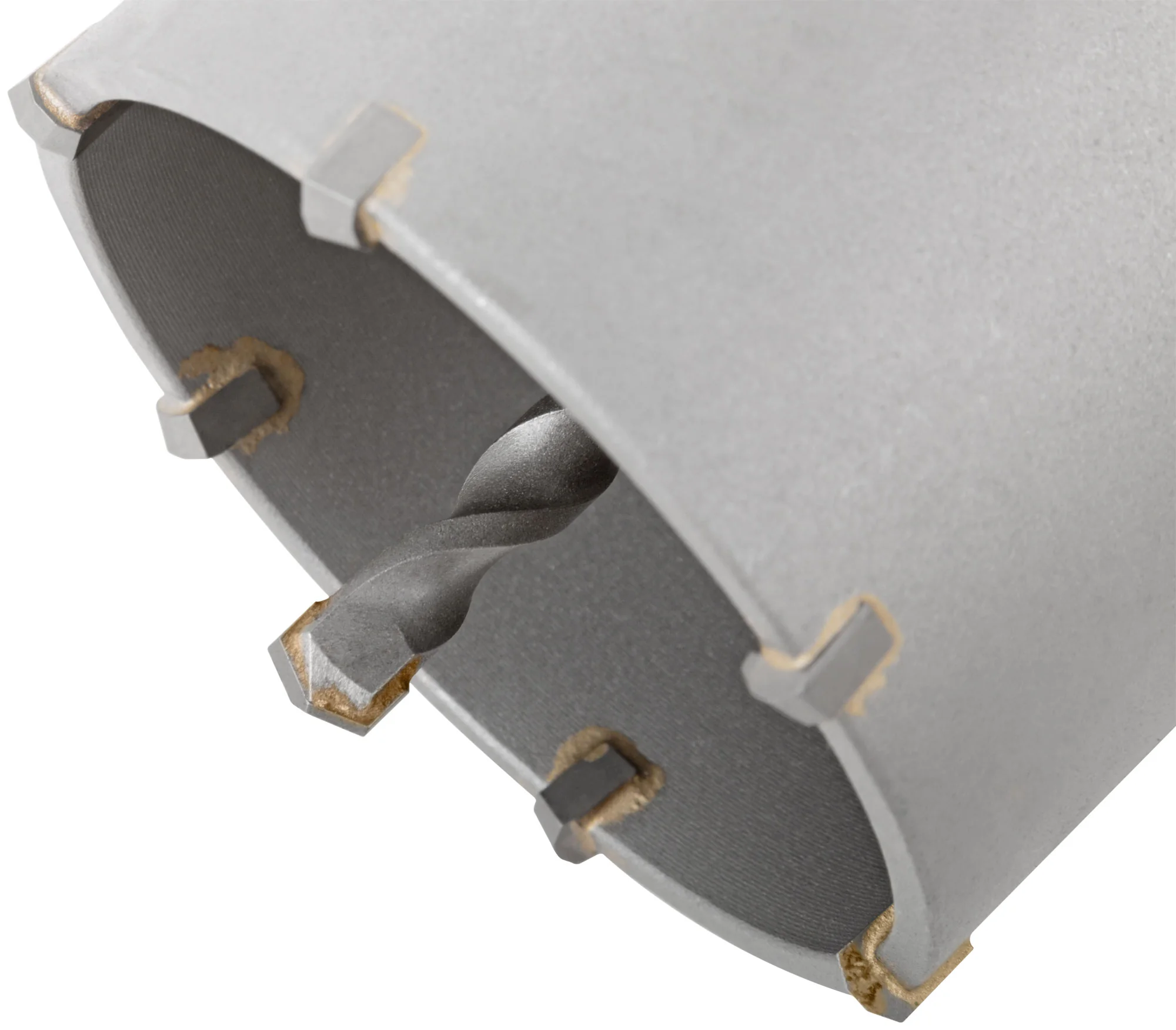 Коронка изготовлена из инструментальной стали, что обеспечивает прочность и долговечность. Твердосплавные резцы с добавлением карбида вольфрама гарантируют высокую износостойкость и эффективность. Посадочное отверстие коронки составляет М22, а универсальный хвостовик SDS-Plus обеспечивает надежное крепление.