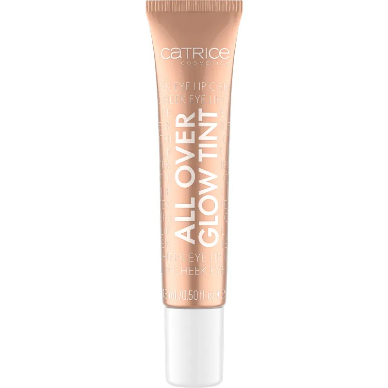 Catrice All Over хайлайтер предлагает идеальное сияние. Продукт содержит витамин C, ниацинамид, сквалан и пантенол, которые придают блеск скулам, векам и губам.