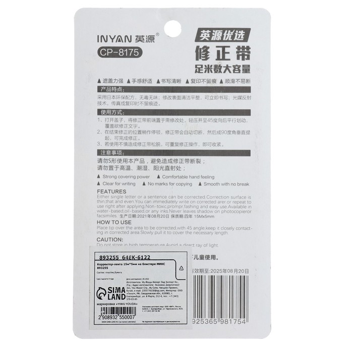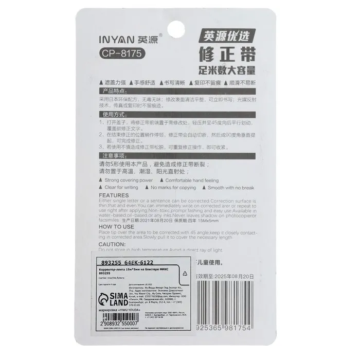 Корректор-лента 15 м × 5 мм, блистер, европодвес, корпус МИКС — Характеристики