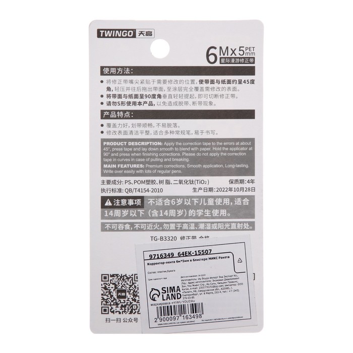 Корректор-лента 6 м × 5 мм «Ракета» в блистере, МИКС — Характеристики