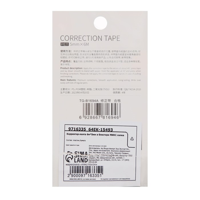 Корректор-лента 6 м × 5 мм, в блистере, МИКС — Характеристики