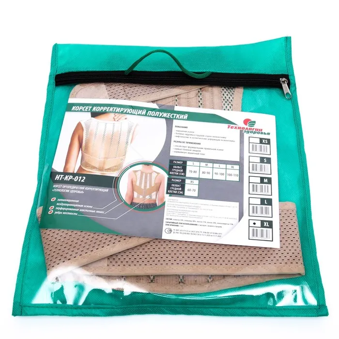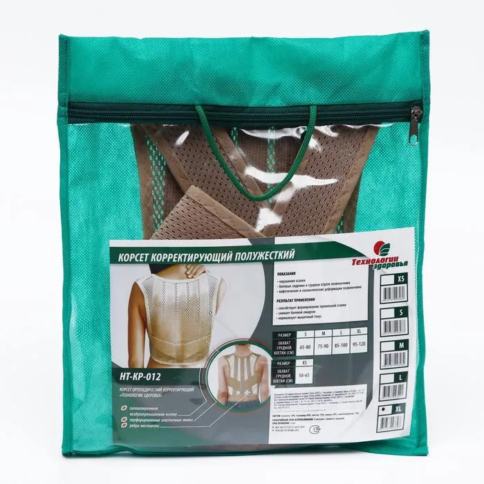 Корректор осанки (Корсет ортопедический реклинирующий классический) обеспечивает полужёсткую фиксацию грудного отдела позвоночника за счёт 4-х металлических рёбер жёсткости и удержание пояса верхней конечности в физиологическом положении с помощью мягких эластичных лямок с возможностью регулирования длины.