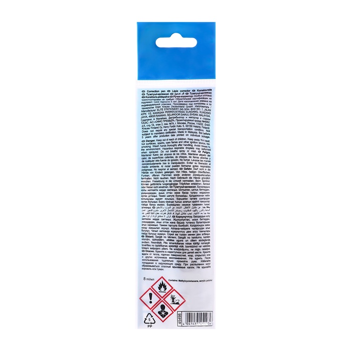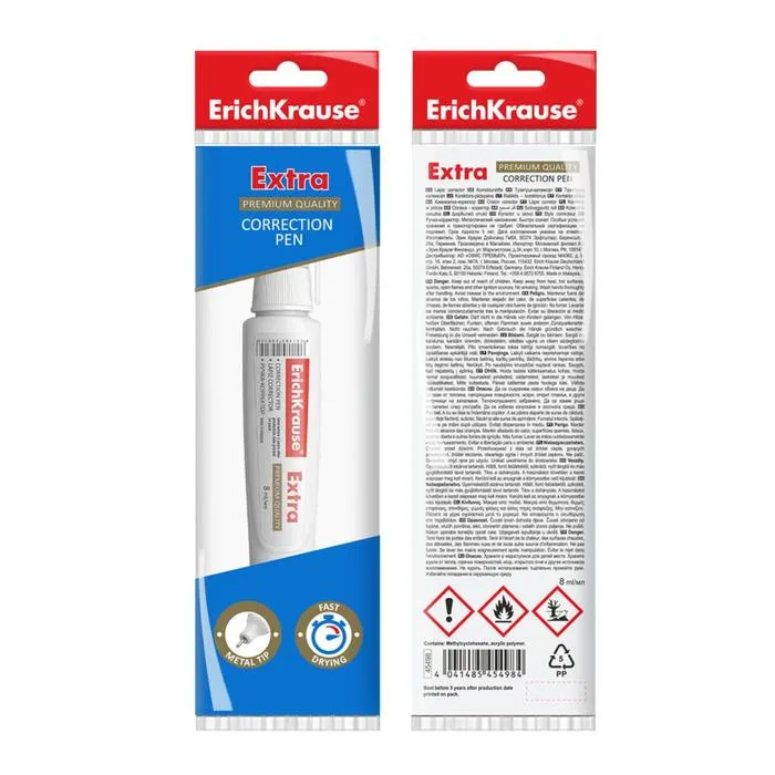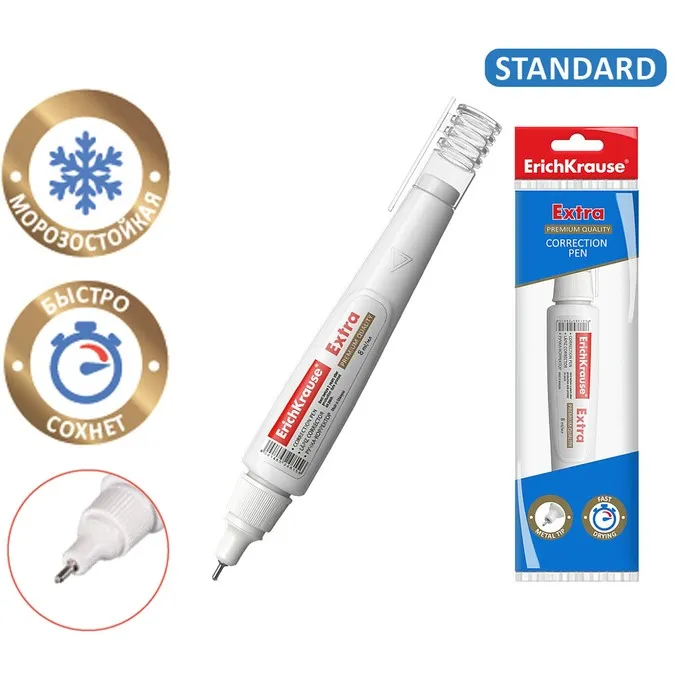 Ручка-корректор с быстросохнущей корректирующей жидкостью для точечных исправлений. Показывает отличный результат на всех типах и цветах чернил. Высококачественный металлический наконечник обеспечивает плавное движение и экономичный расход. Жидкость удобно наносить локально на необходимый фрагмент, создавая непрозрачный слой, незаметный на ксерокопиях. Морозостойкая. На основе растворителя. Перед применением жидкость необходимо взболтать с помощью внутреннего металлического шарика.