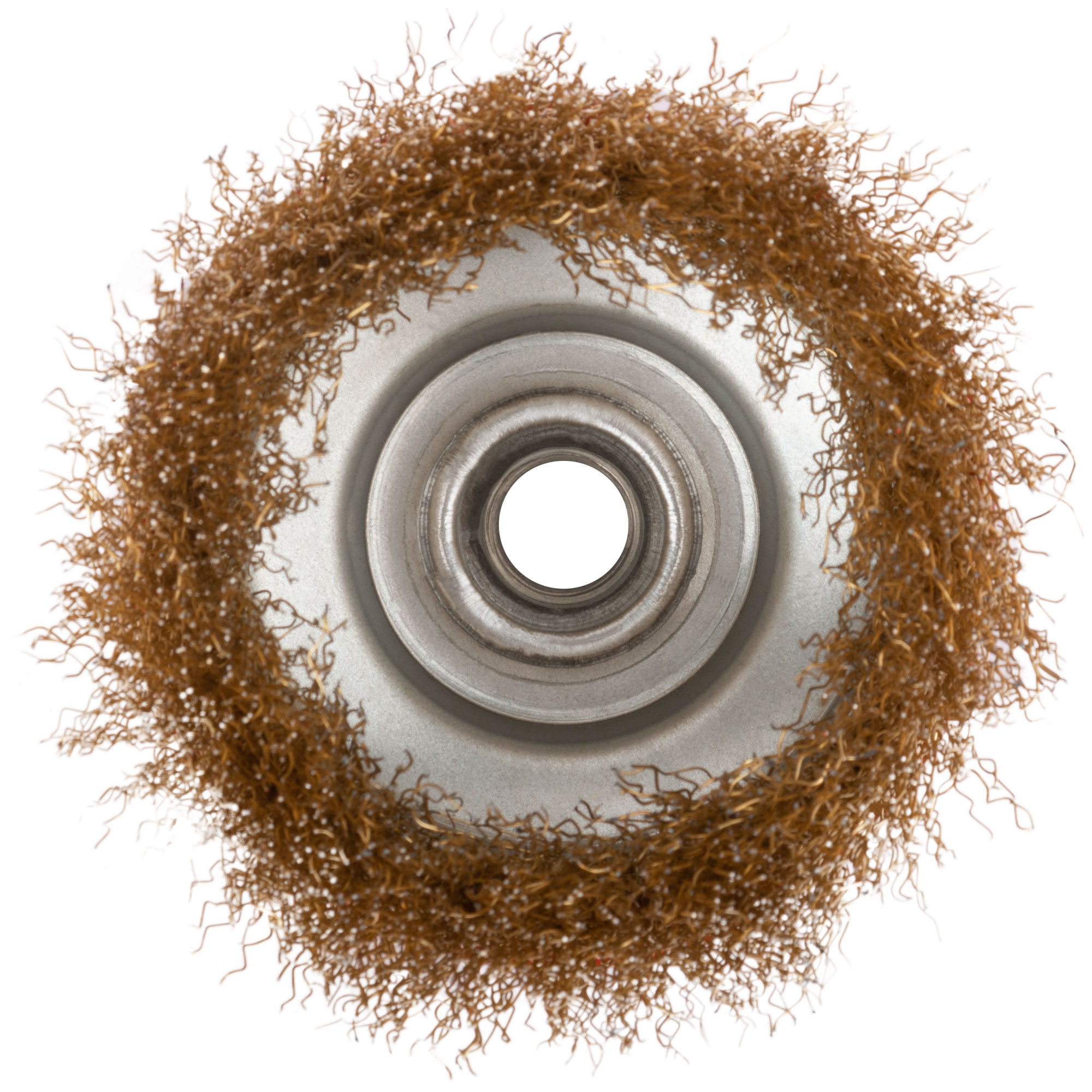 Изготовлена из стальной латунированной проволоки, эта корщетка обеспечивает долговечность и устойчивость к износу. Гайка М14 позволяет надежно крепить её к большинству моделей УШМ, обеспечивая стабильность при работе.