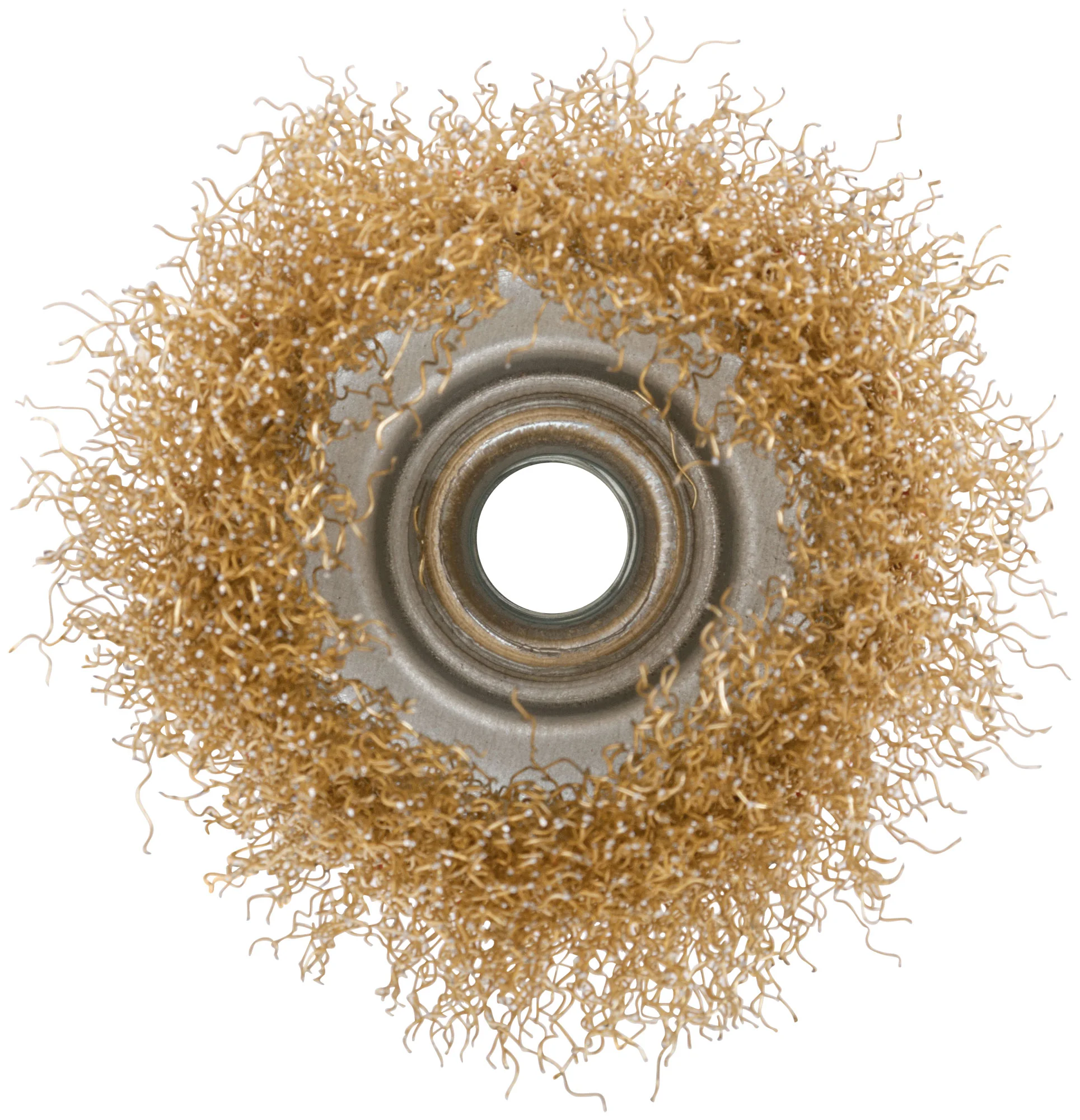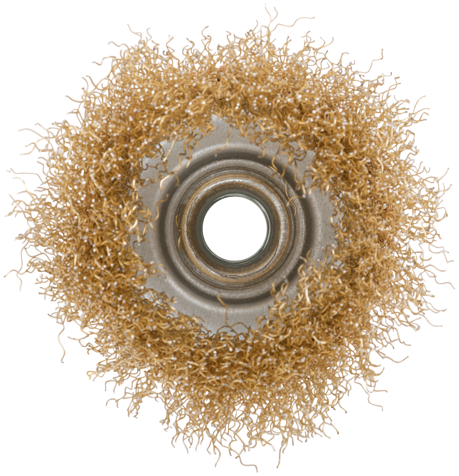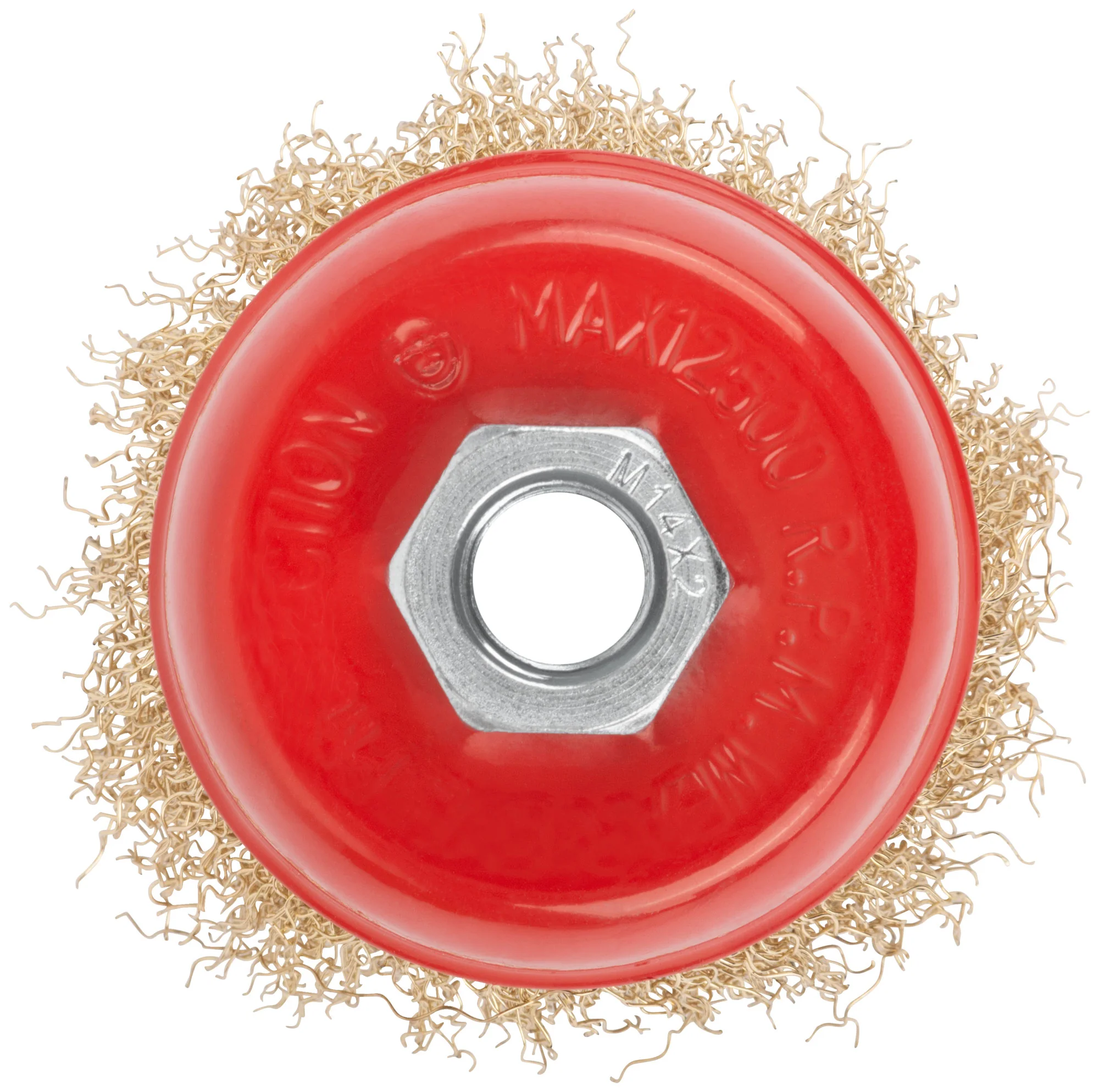 Изготовлена из стальной латунированной волнистой проволоки, что обеспечивает долговечность и повышенную стойкость к износу. Оснащена гайкой М14 для быстрой и надежной фиксации на инструменте.