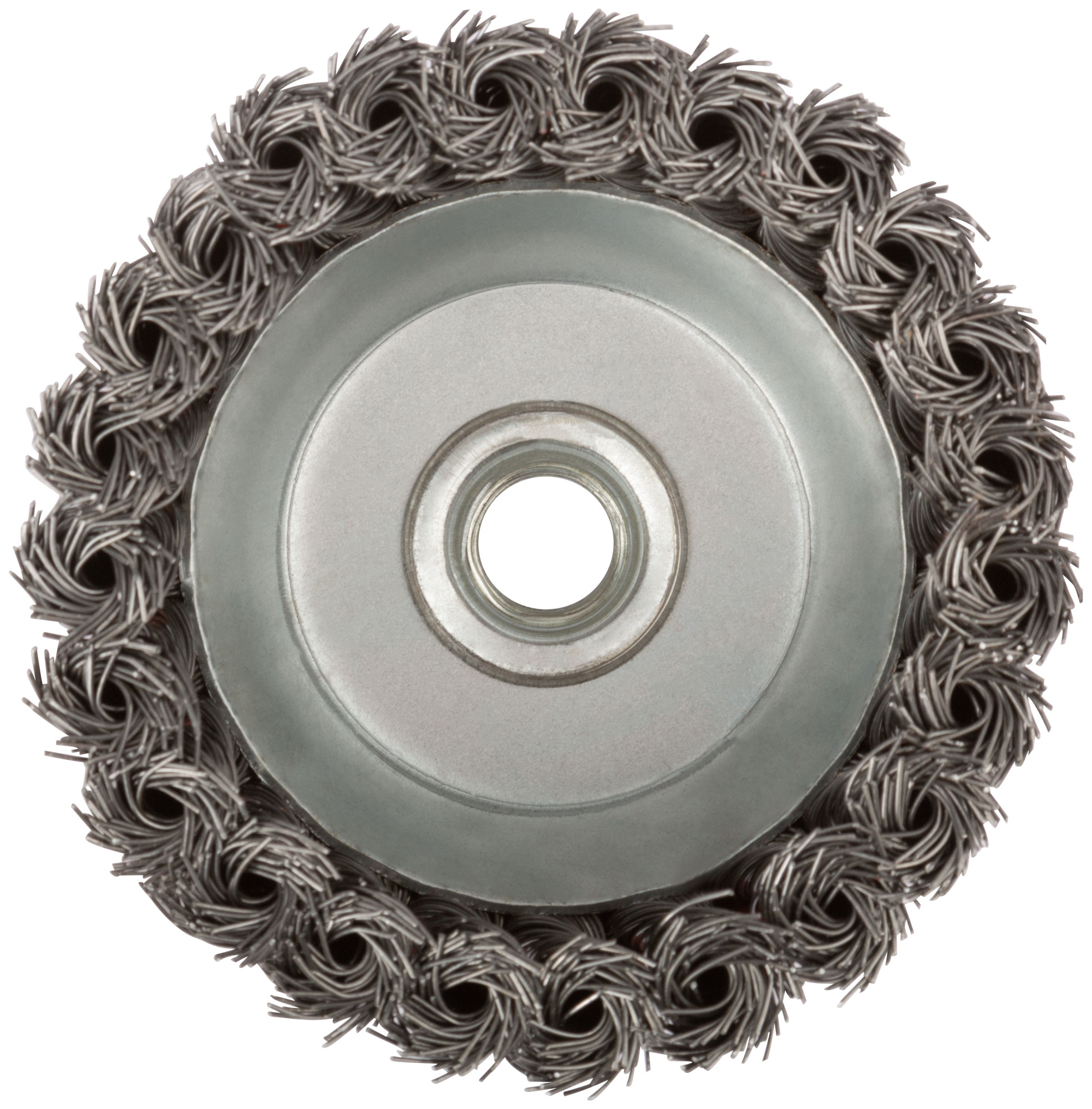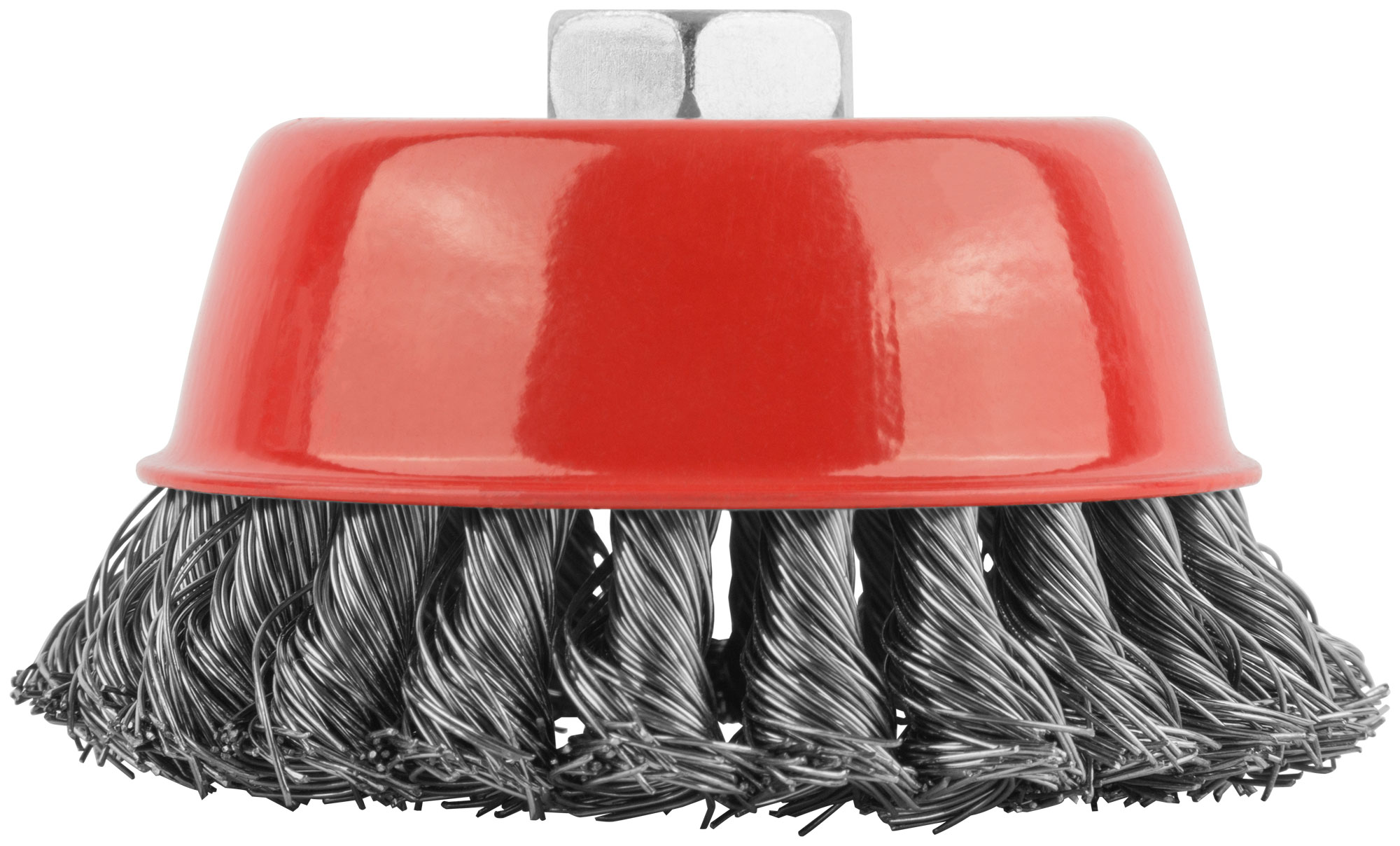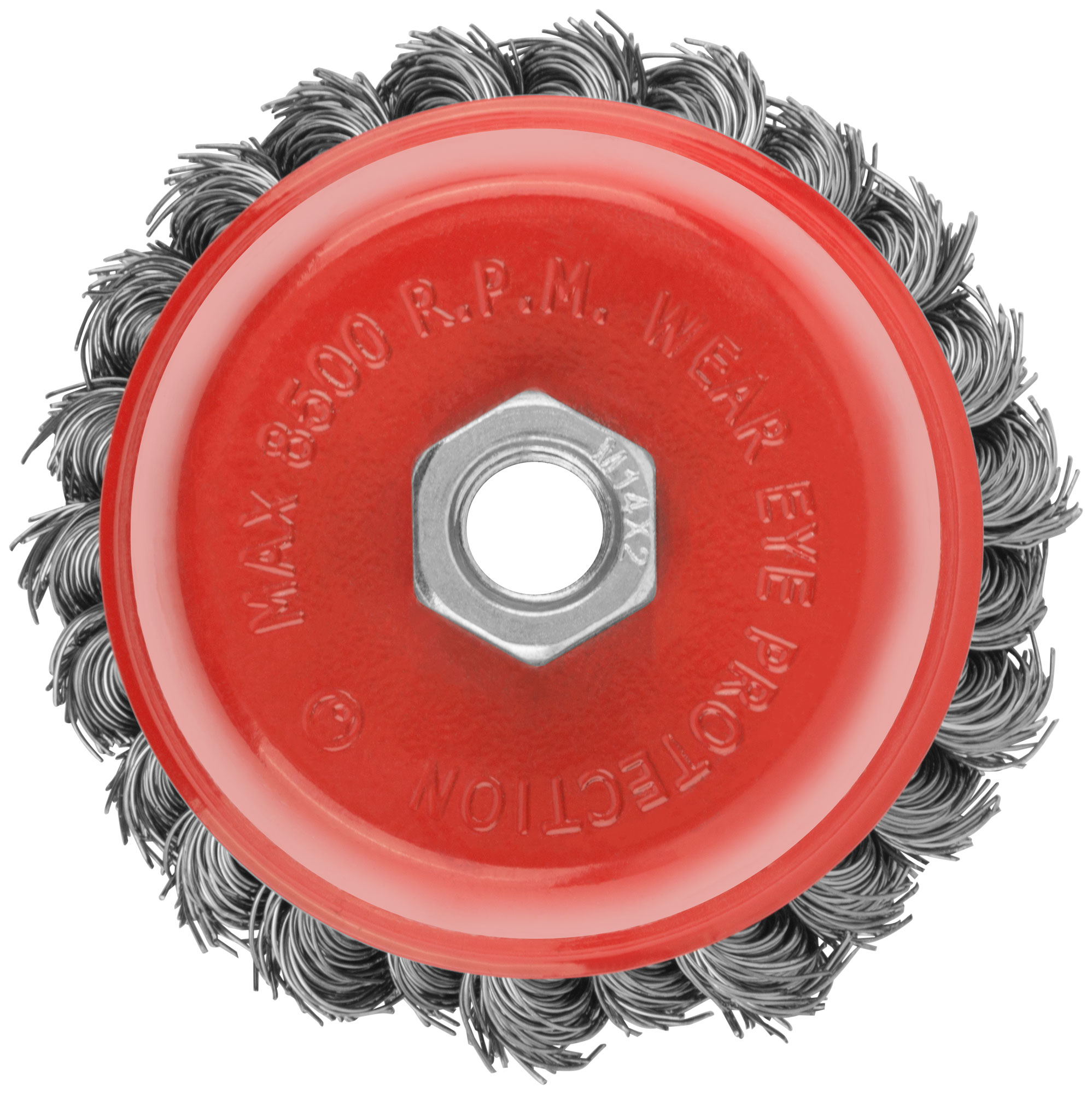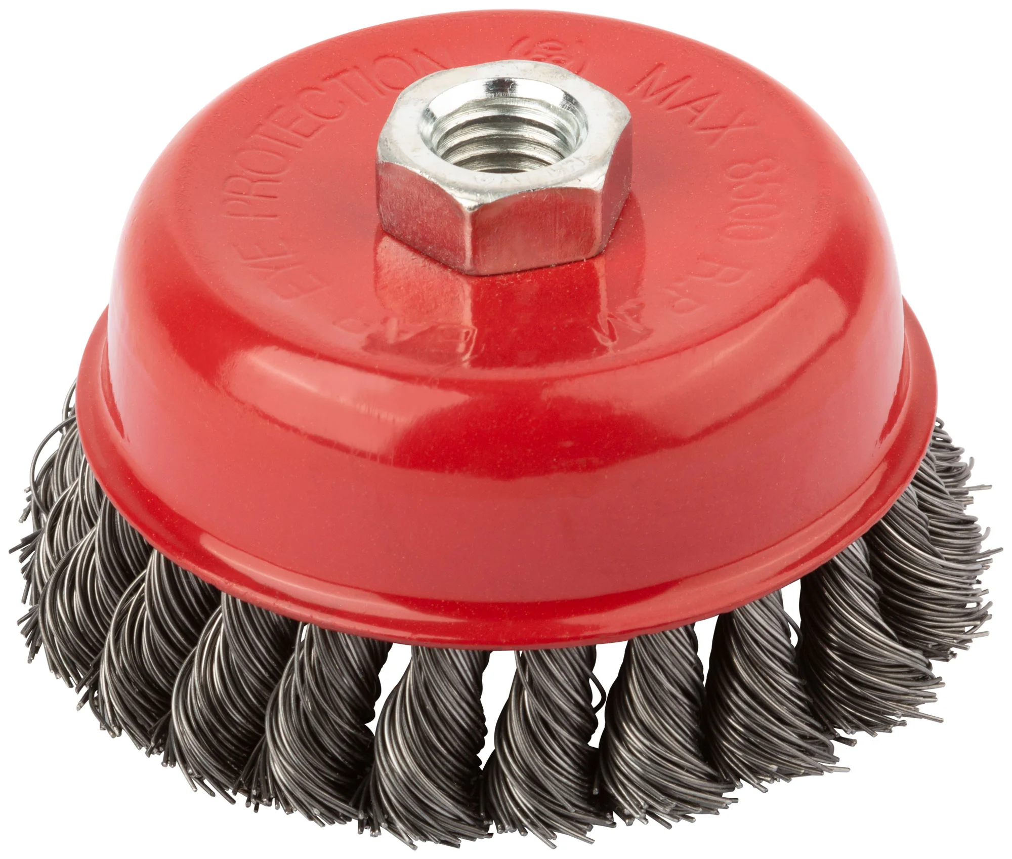 Корщетка оснащена гайкой М14, что позволяет легко и быстро устанавливать её на угловую шлифовальную машину (УШМ). Изготовлена из стальной витой проволоки, которая гарантирует долговечность и высокую износостойкость. Максимальная скорость вращения — 8500 об/мин.