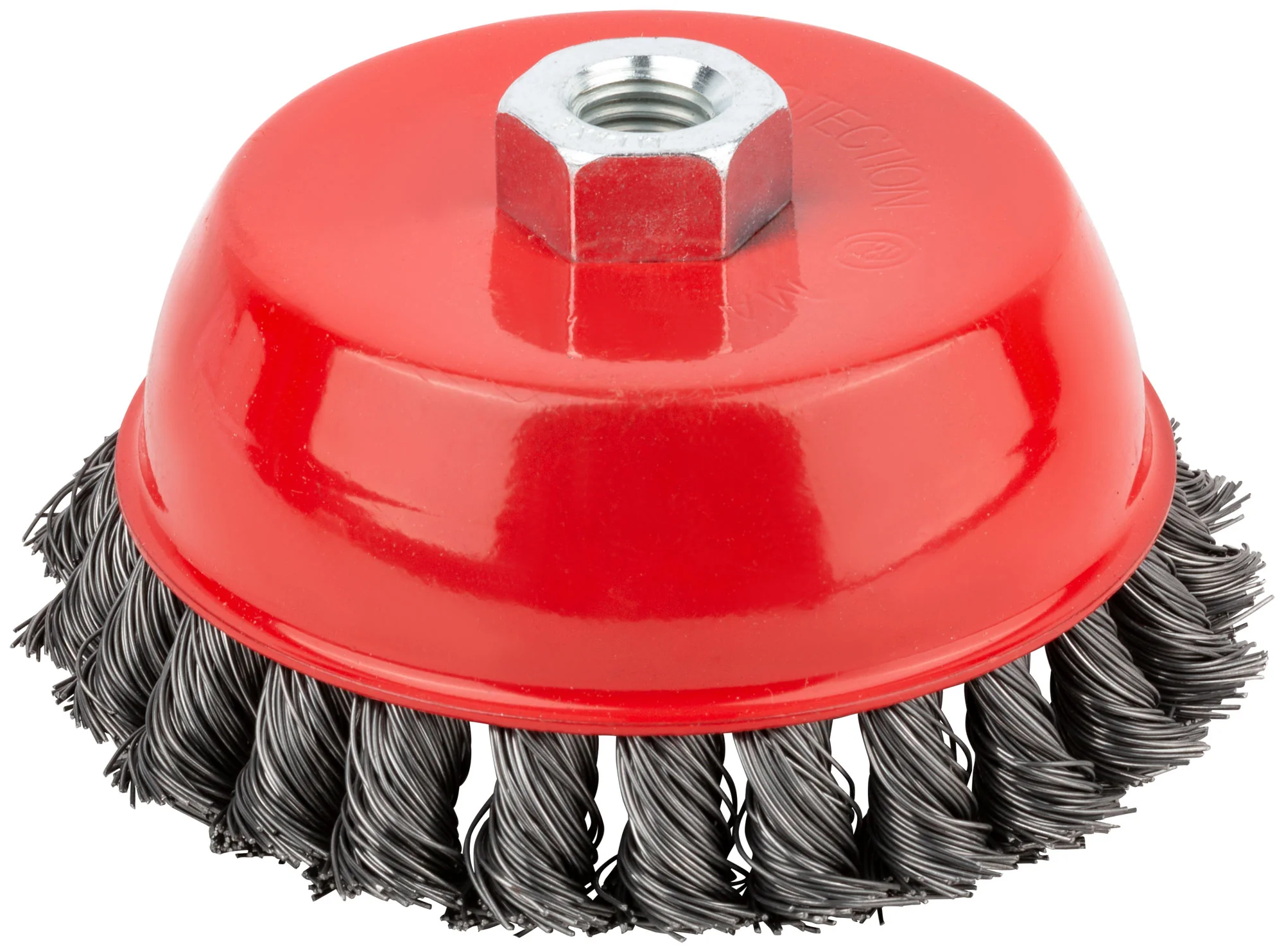 Корщетка чашечная от бренда КУРС — идеальный инструмент для очистки металлических поверхностей от ржавчины, краски и других загрязнений. Она используется с угловыми шлифовальными машинами, что делает её незаменимой в арсенале профессиональных мастеров и строителей.