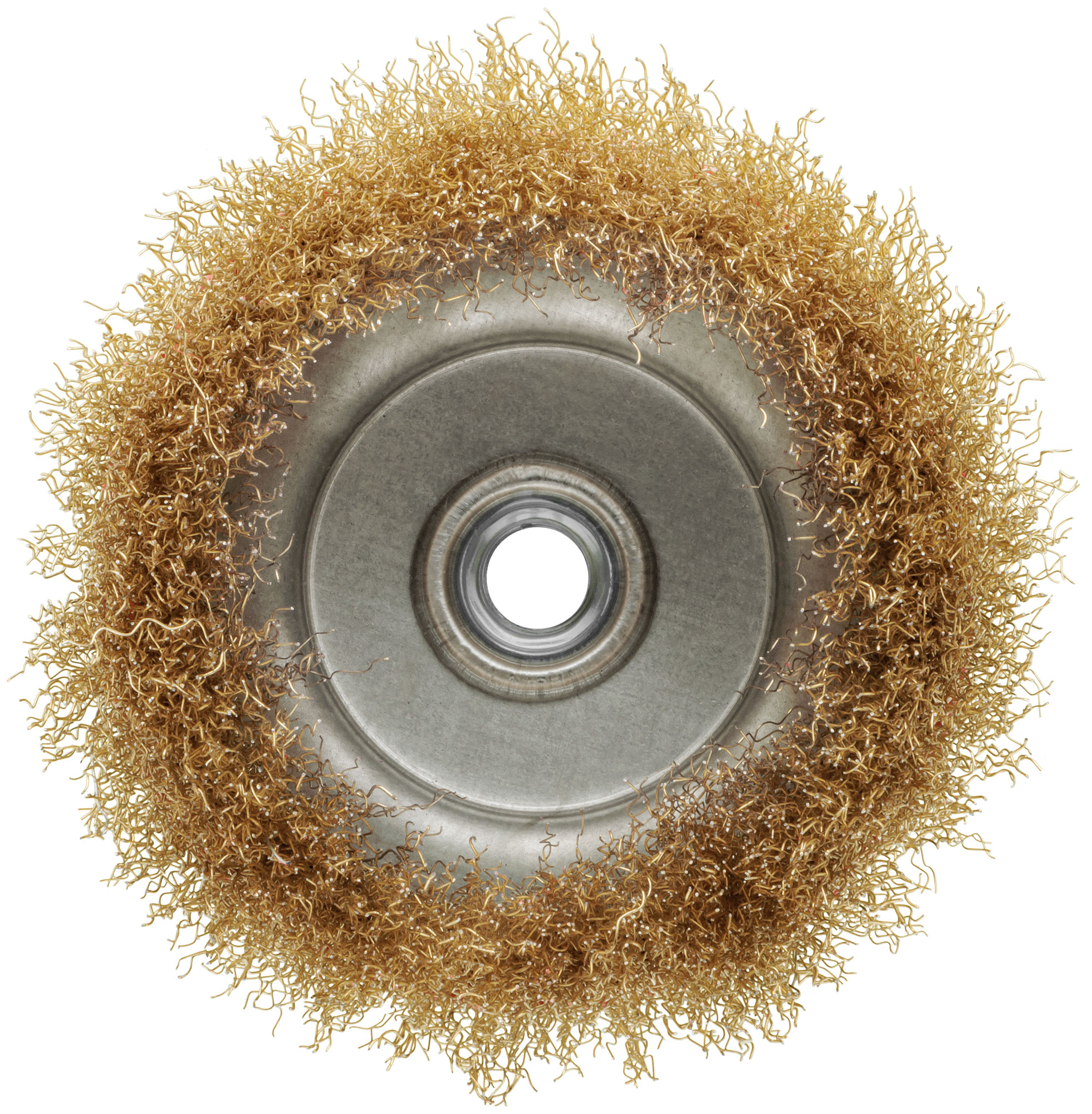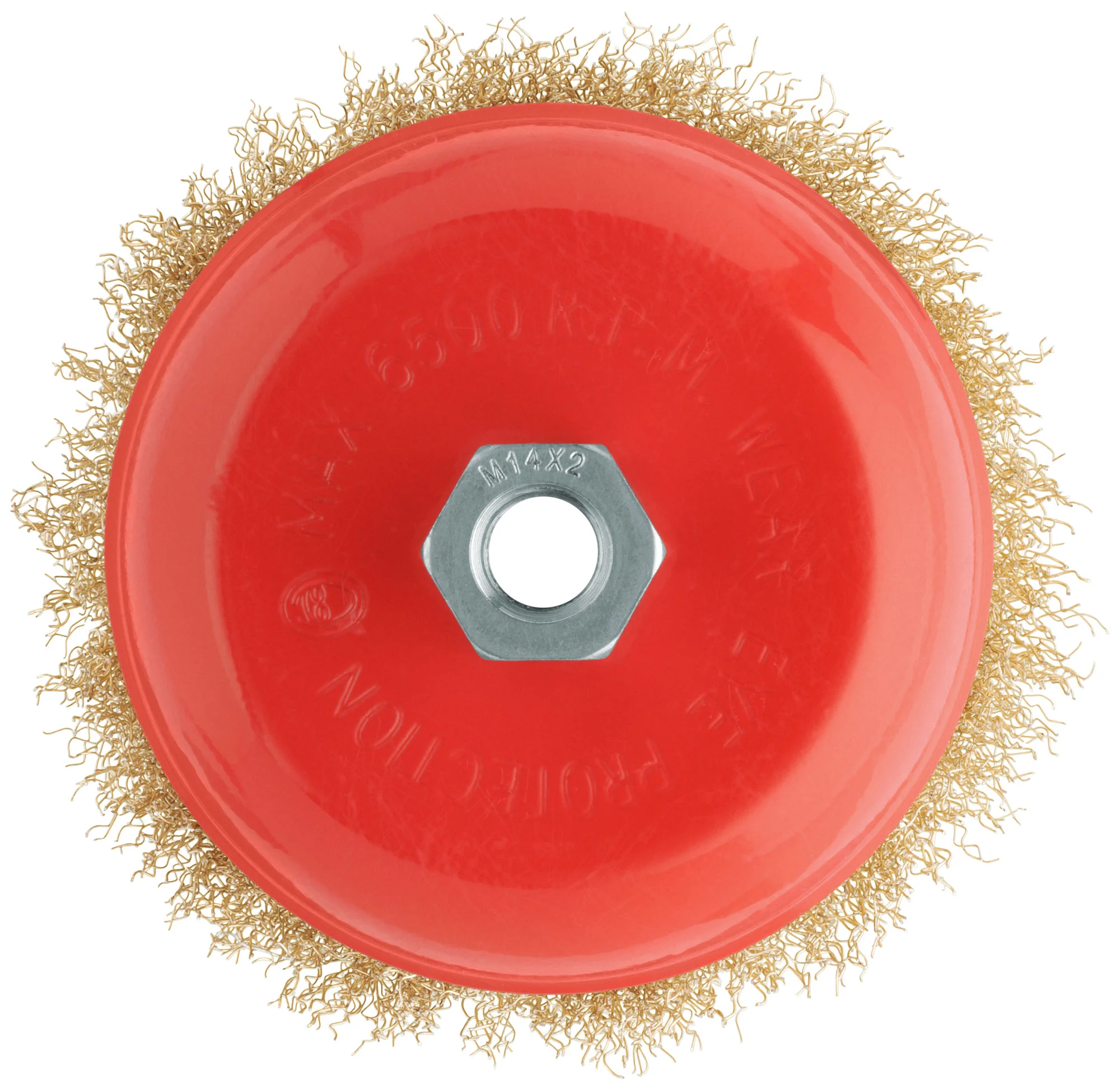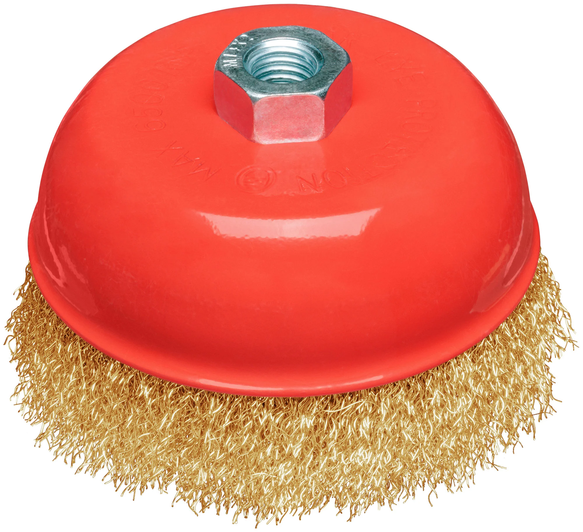 Изготовлена из стальной латунированной волнистой проволоки, что обеспечивает долговечность и высокую эффективность работы. Гайка М14 позволяет легко и быстро крепить корщетку к УШМ.