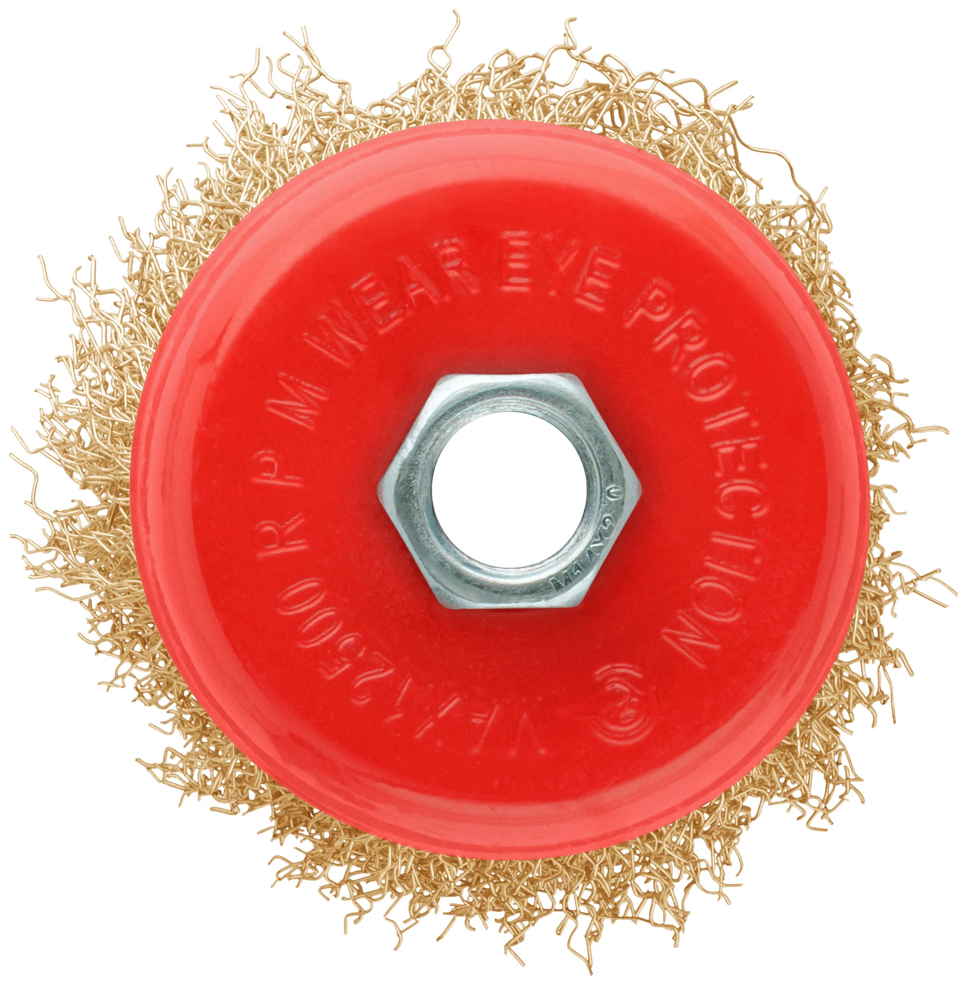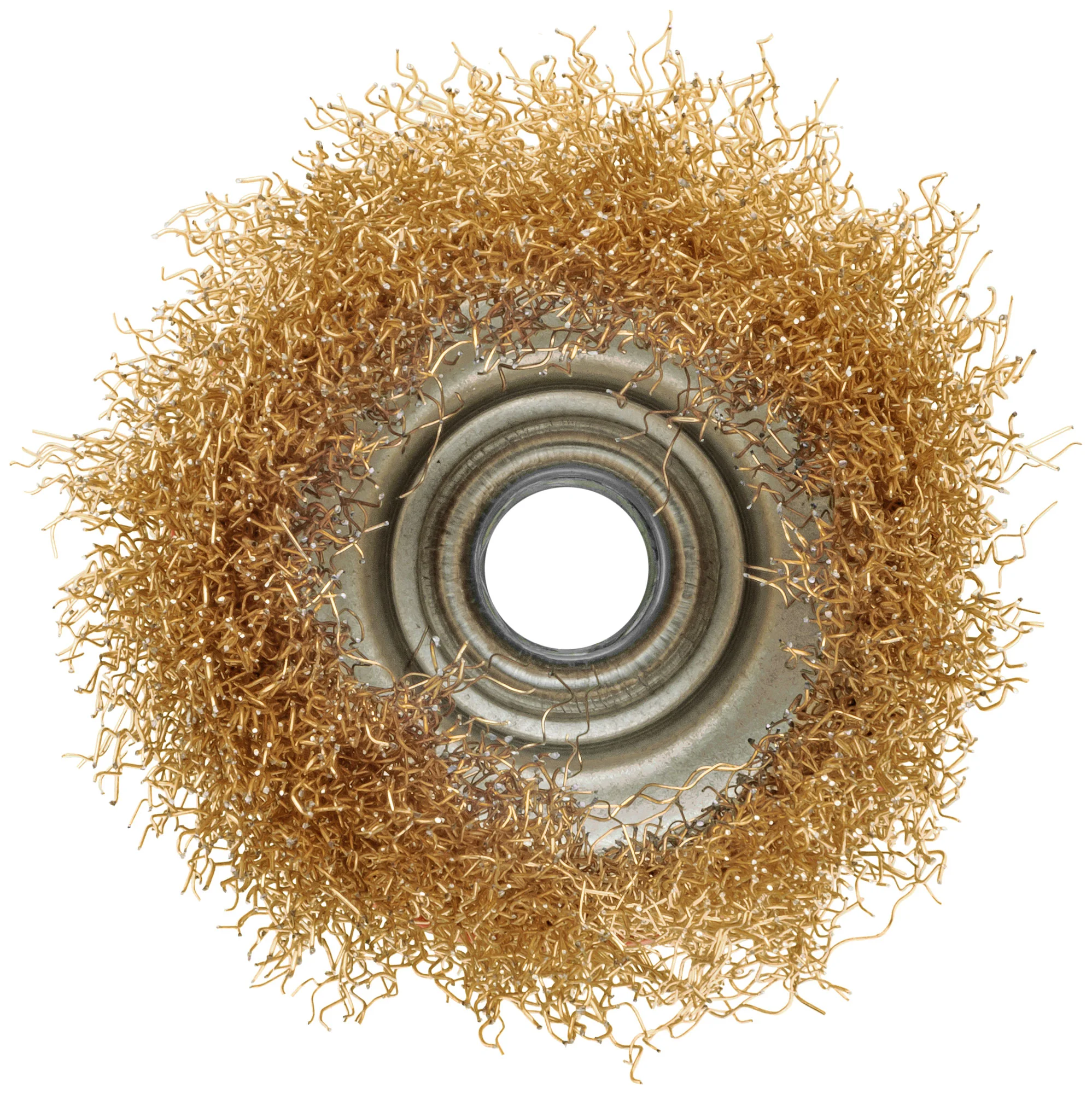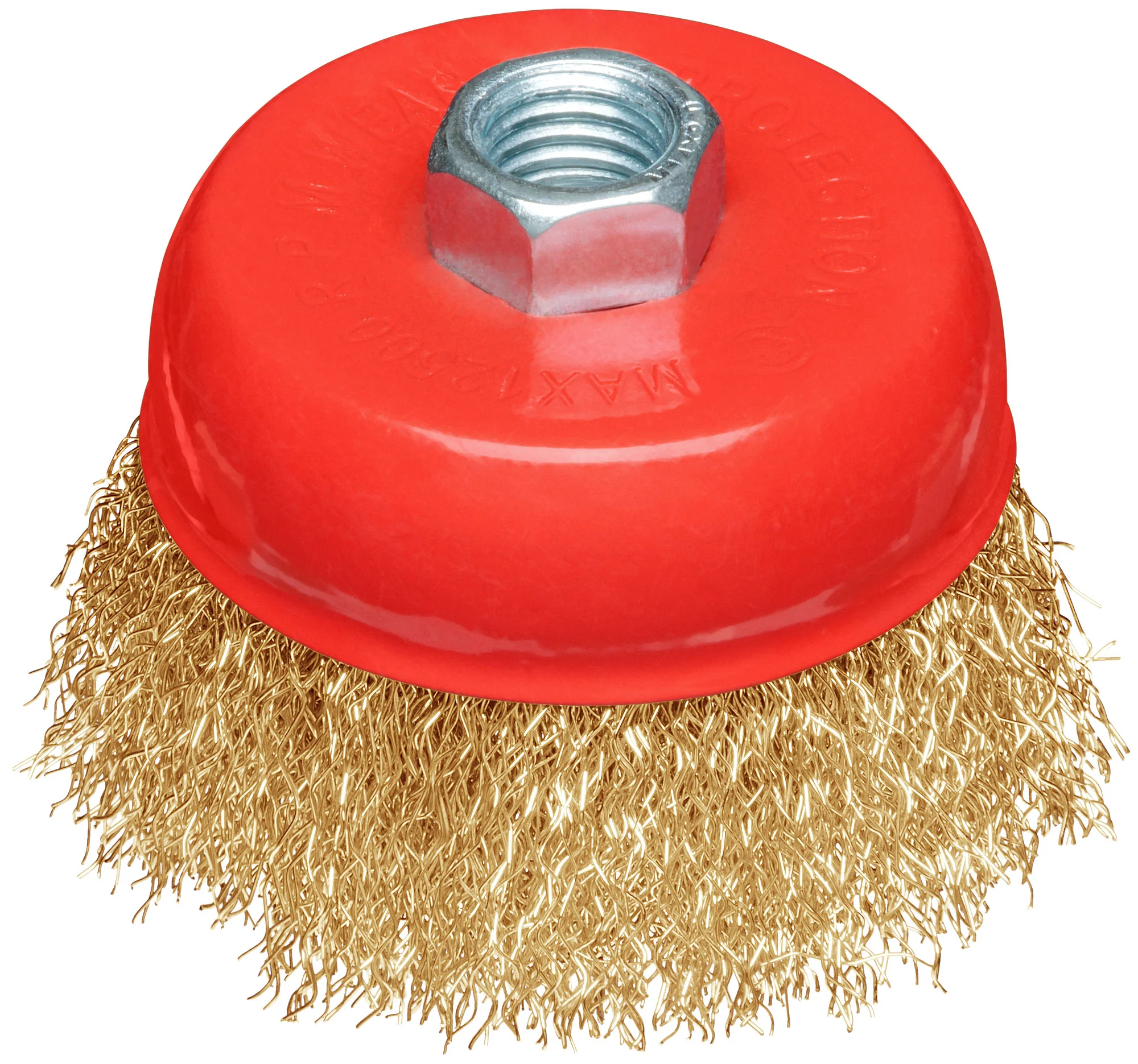 Оснащена гайкой М14, что обеспечивает надежное крепление на угловой шлифовальной машине. Изготовлена из стальной латунированной волнистой проволоки, что повышает износостойкость и долговечность изделия.