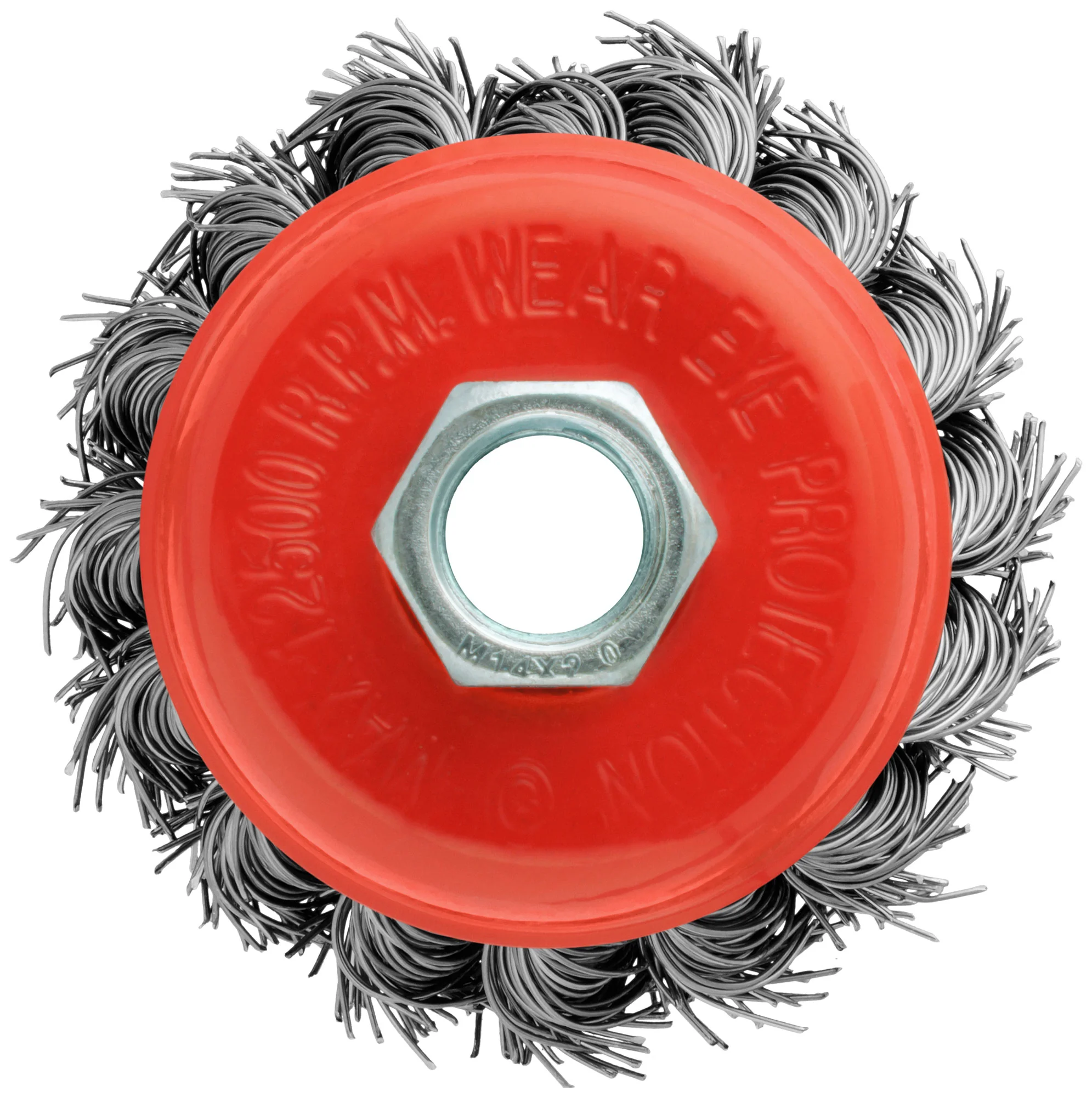 Изготовлена из стальной витой проволоки, корщетка гарантирует долгий срок службы и отличную производительность даже при интенсивной эксплуатации. Гайка M14 обеспечивает надежное крепление на УШМ, что повышает безопасность и удобство работы.