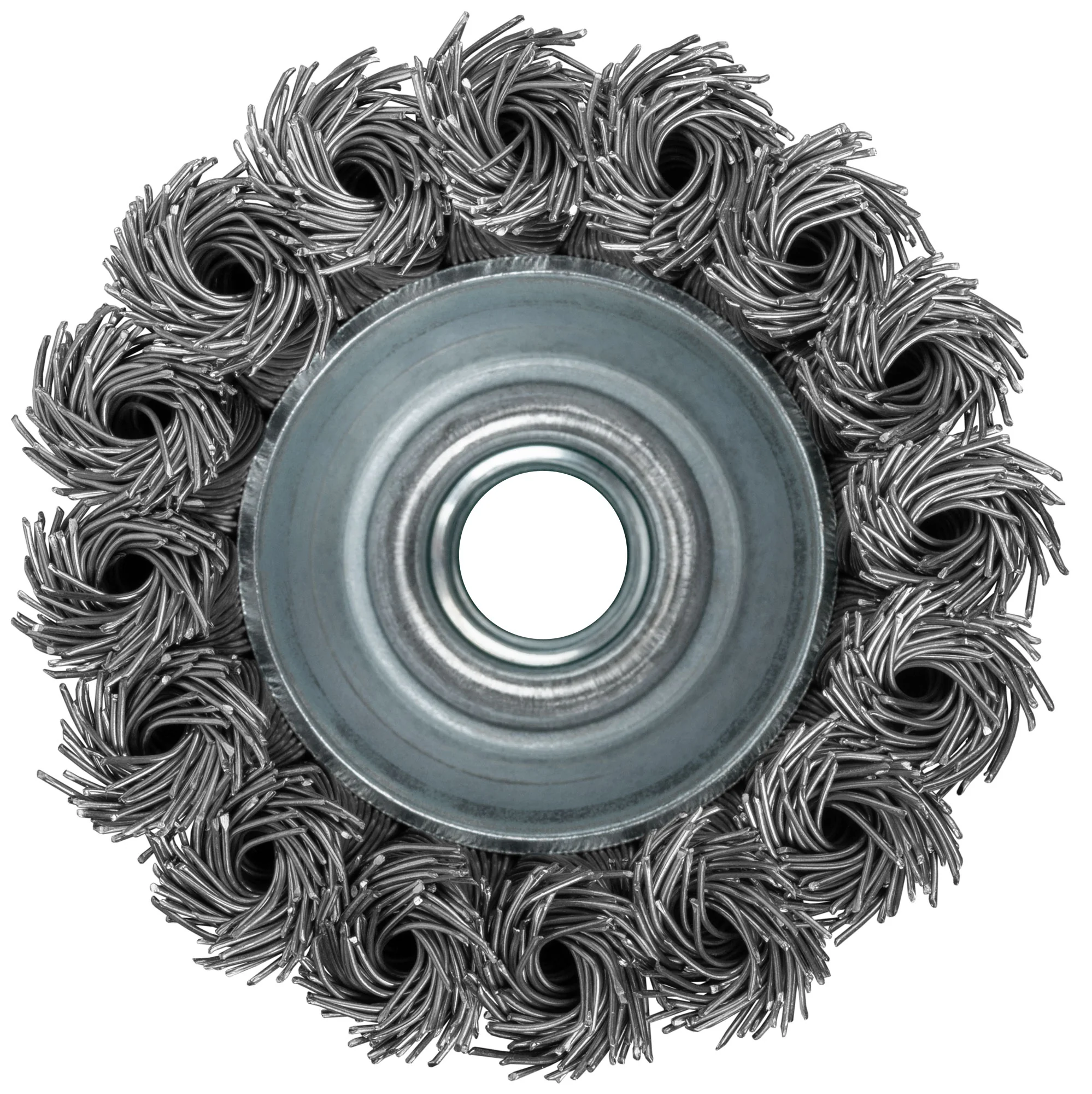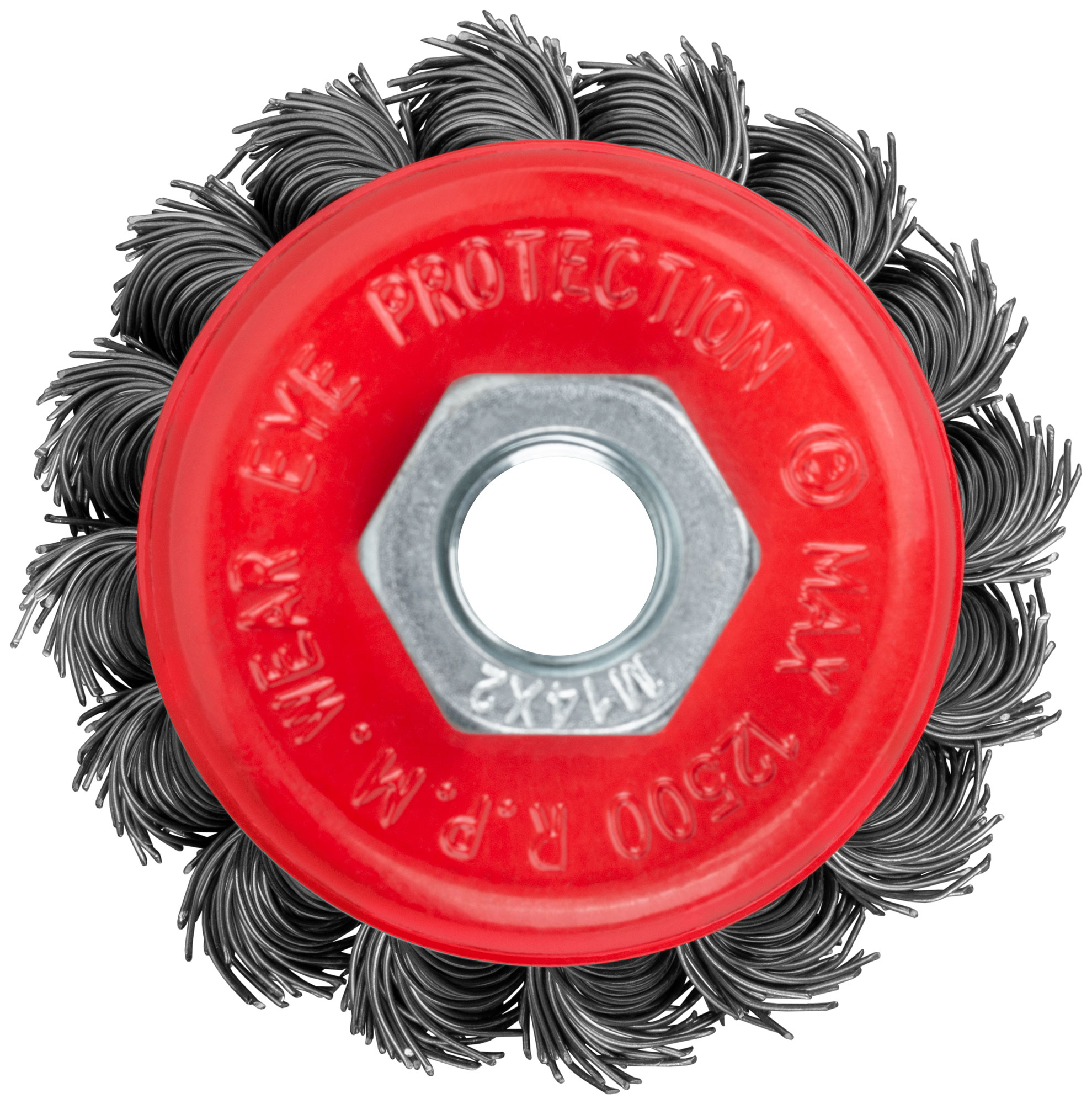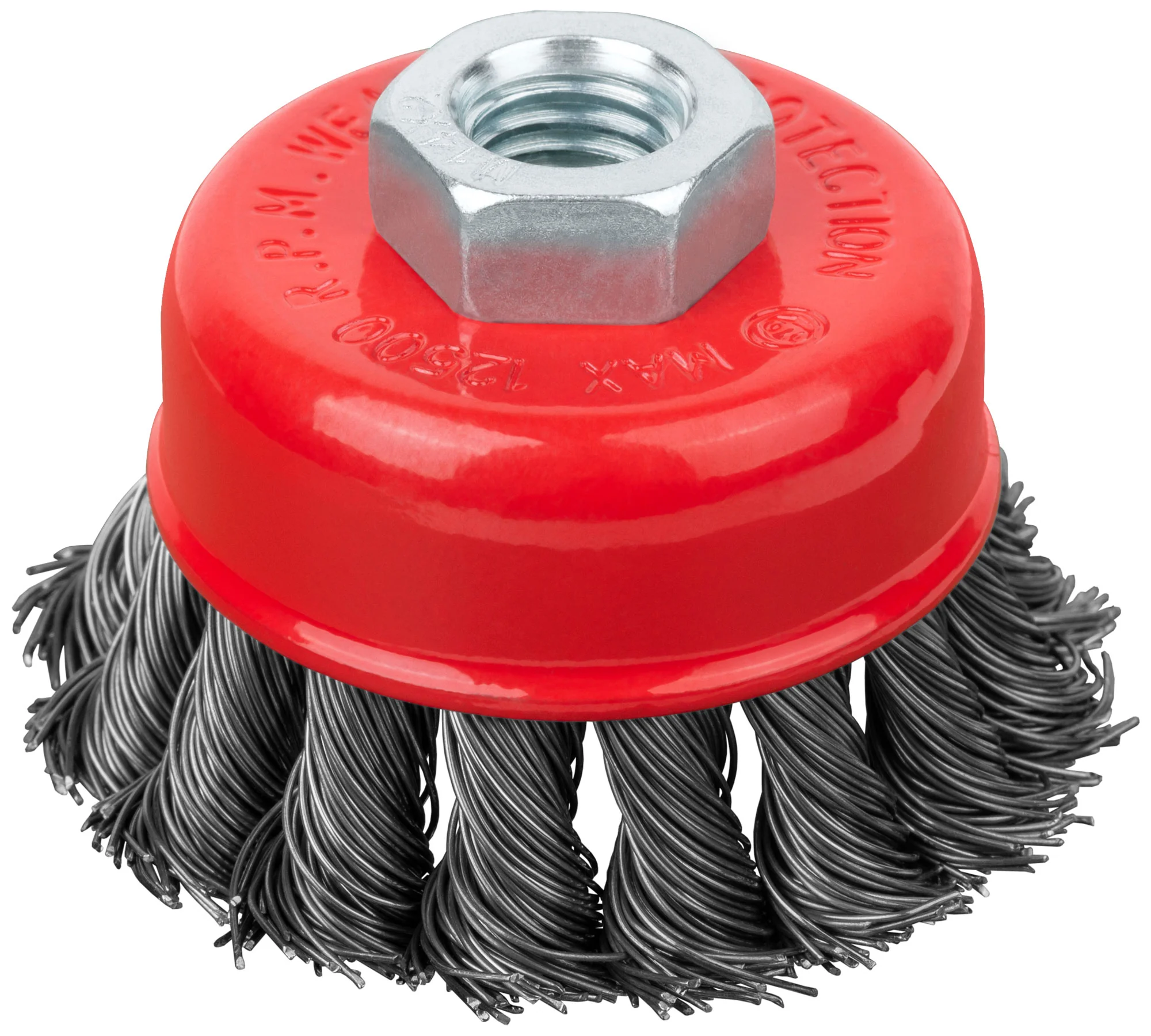 Конструкция из стальной витой проволоки обеспечивает долговечность и высокую эффективность. Подходит для использования с угловыми шлифовальными машинами (УШМ) благодаря стандартной гайке М14 и размеру 65 мм.