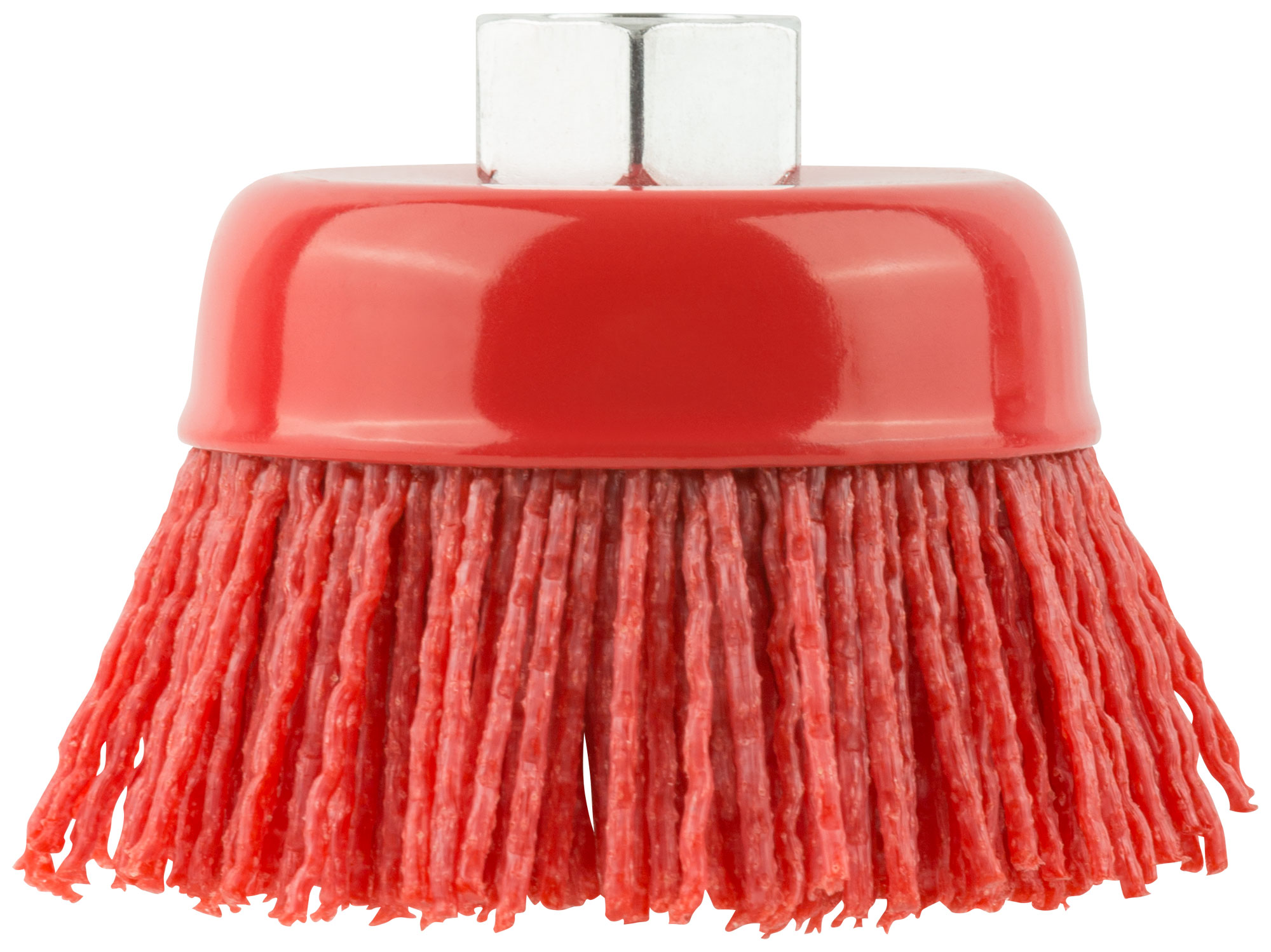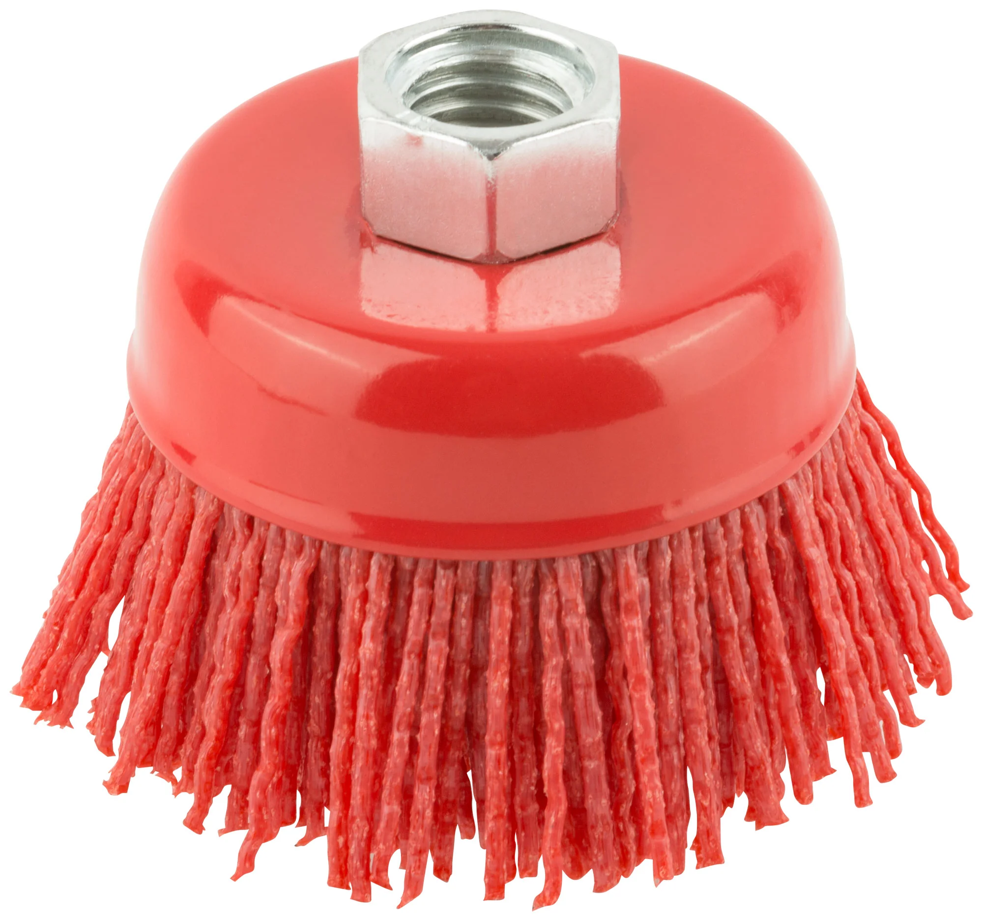 Корщетка-чашка выполнена из нейлона с добавлением алюминий-оксидного абразива, что обеспечивает долговечность и эффективность. Основание изготовлено из инструментальной стали, что гарантирует прочность и надежность конструкции. Гайка М14 позволяет легко и быстро установить насадку на угловую шлифовальную машину (УШМ).