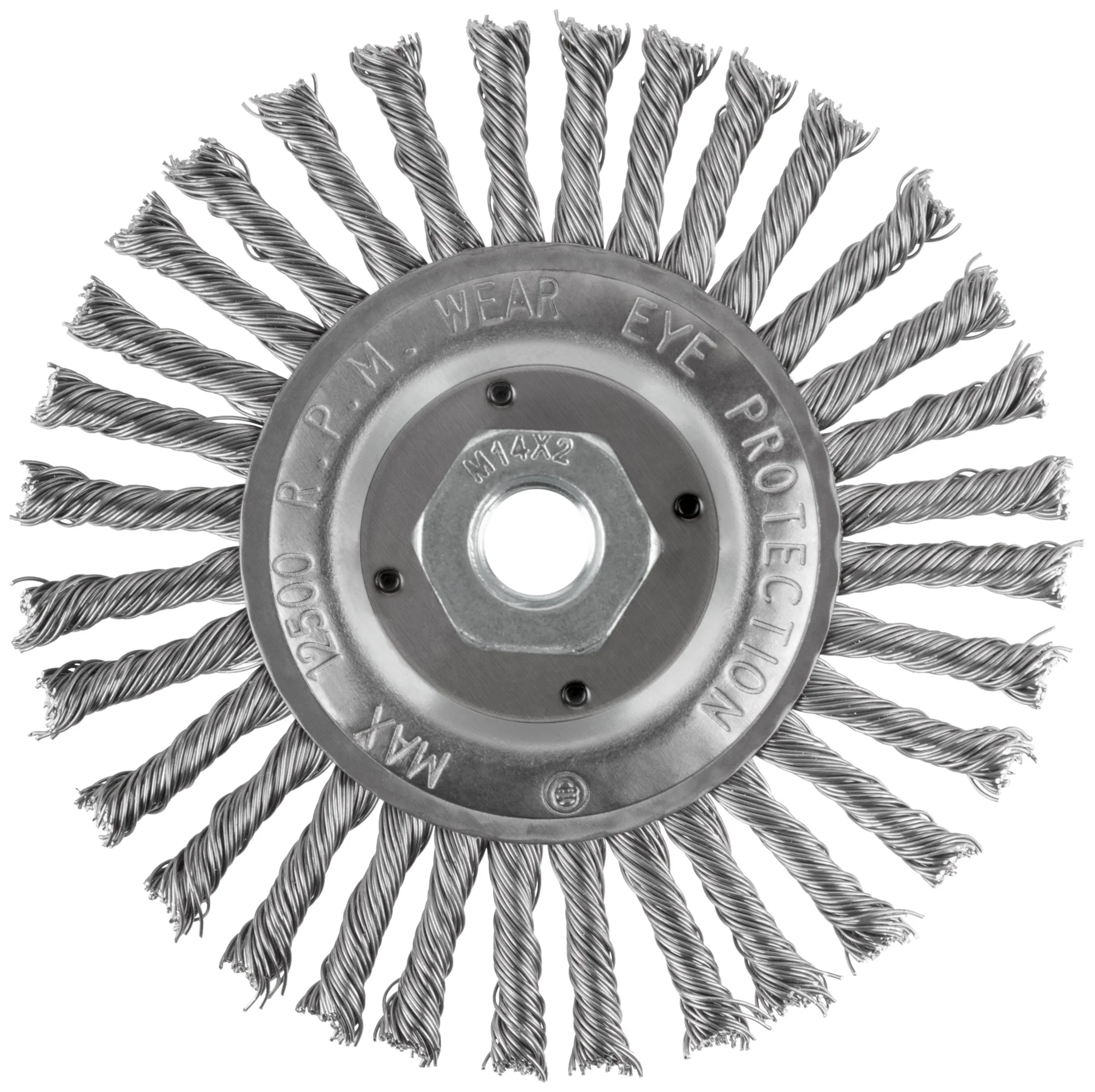 Эта корщетка-колесо диаметром 125 мм незаменима при работах с металлом, таких как удаление ржавчины и старой краски. Она легко устанавливается на углошлифовальную машину благодаря стандартной гайке М14, позволяя быстро подготовить металлические поверхности для дальнейшей обработки.
