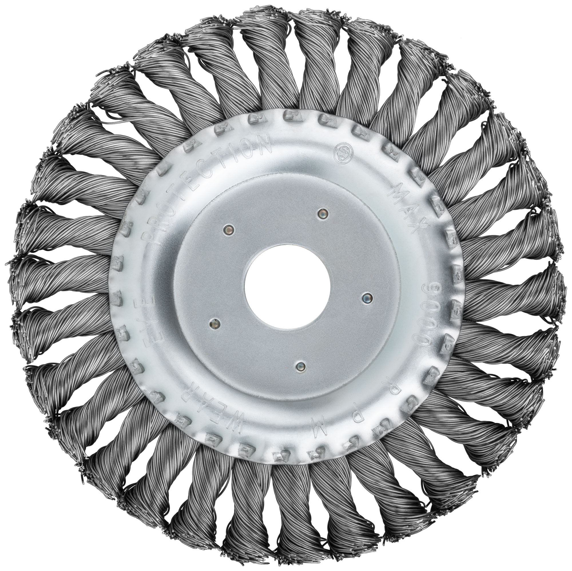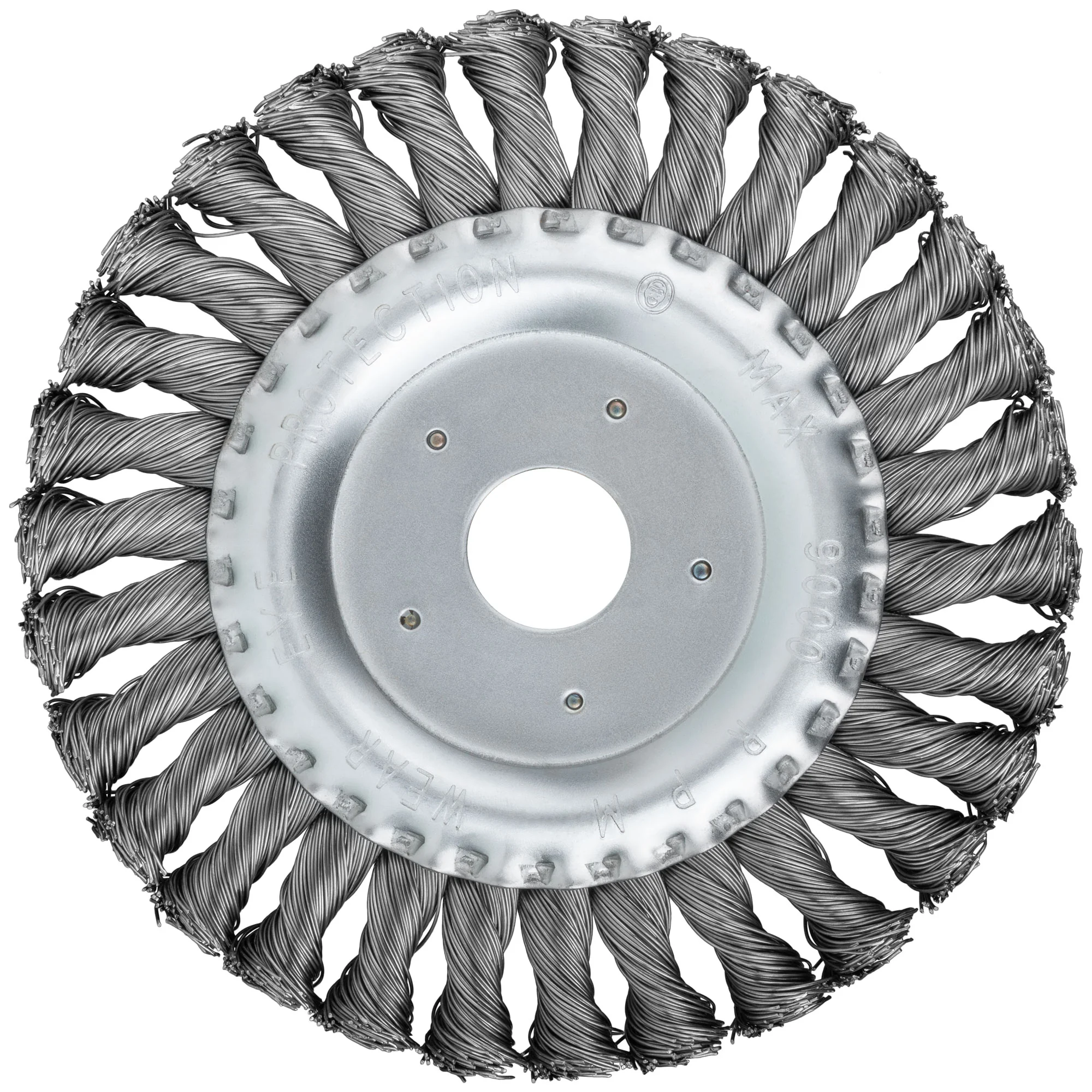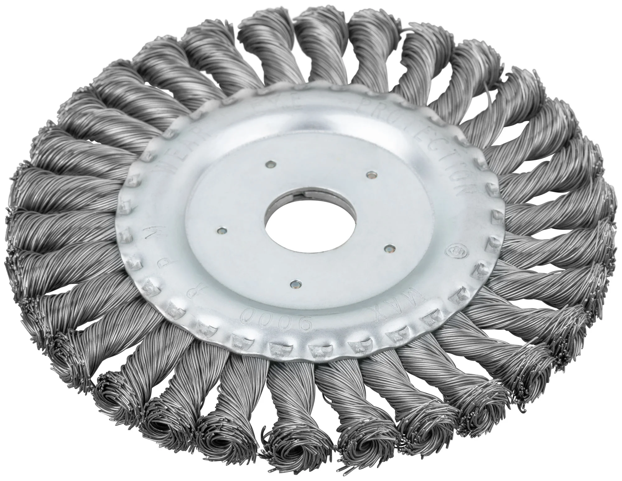 Данная корщетка-колесо снабжена витой стальной проволокой, что обеспечивает её высокую износостойкость и долговечность. Посадочный диаметр 22,2 мм позволяет легко устанавливать её на угловую шлифовальную машину (УШМ) и работать с максимальной скоростью до 9000 об/мин.