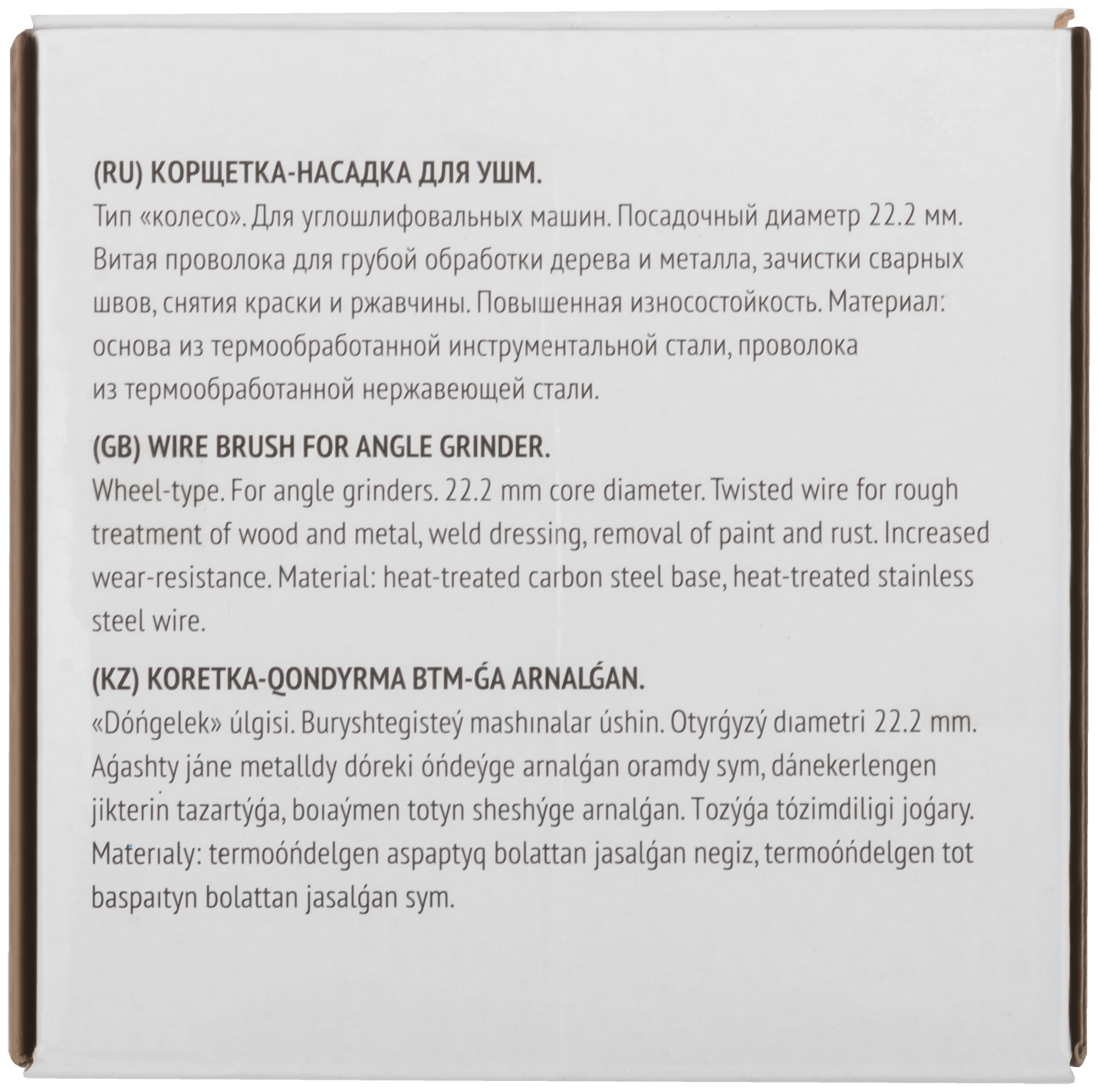 Изделие выполнено из витой проволоки из нержавеющей стали, что гарантирует повышенную износостойкость. Посадочный диаметр 22,2 мм обеспечивает совместимость с большинством стандартных УШМ. Корщетка имеет основу из инструментальной стали, что повышает ее прочность и долговечность.