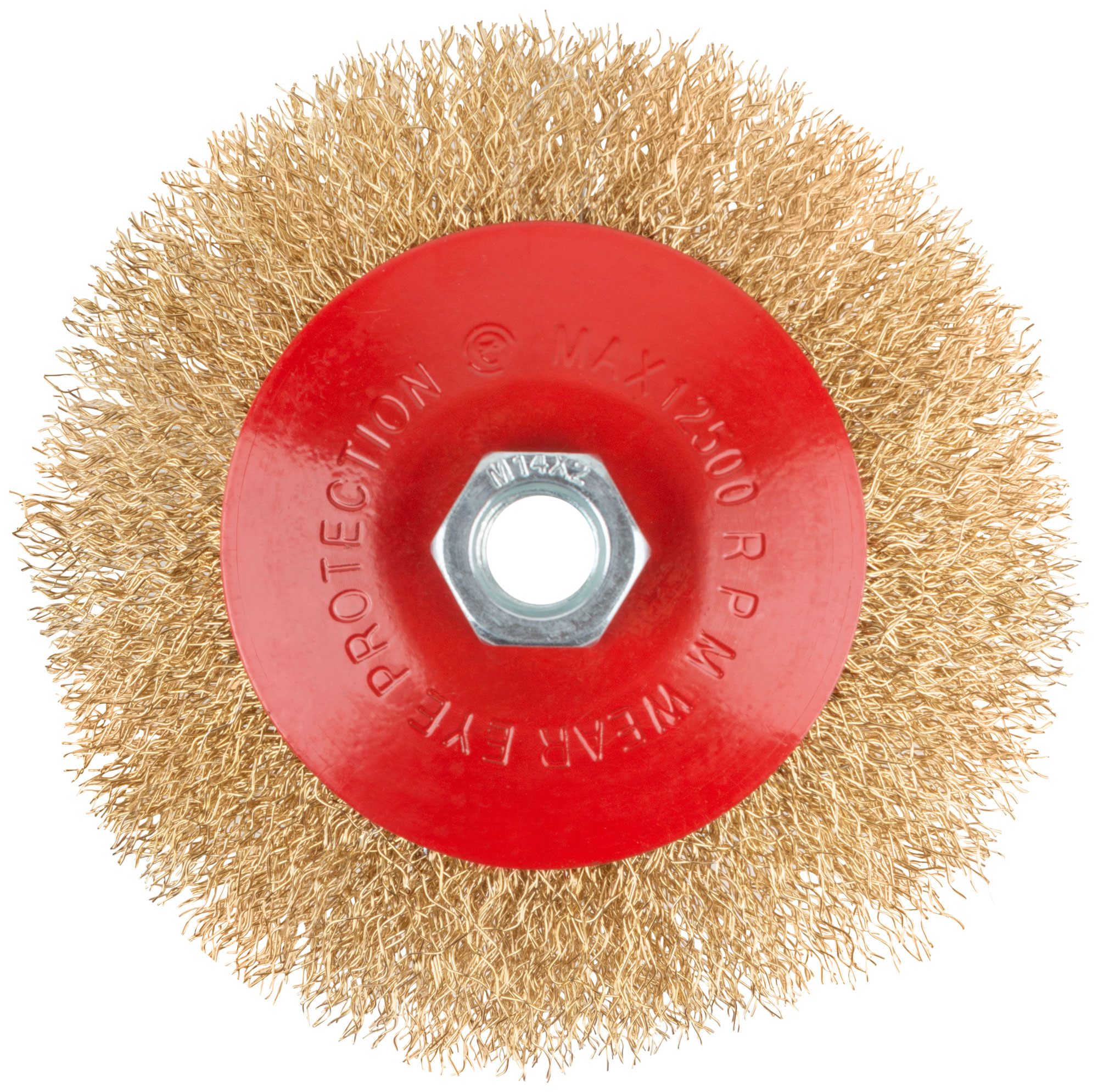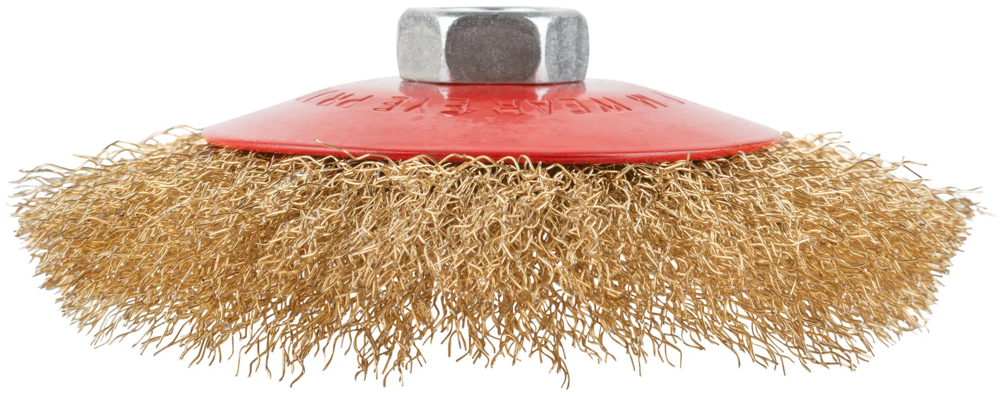Корщетка изготовлена из стальной волнистой латунированной проволоки, что обеспечивает её долговечность и надежность в использовании. Диаметр 125 мм и конструкция с наклоном позволяют добраться до труднодоступных мест, обеспечивая качественную обработку поверхности.