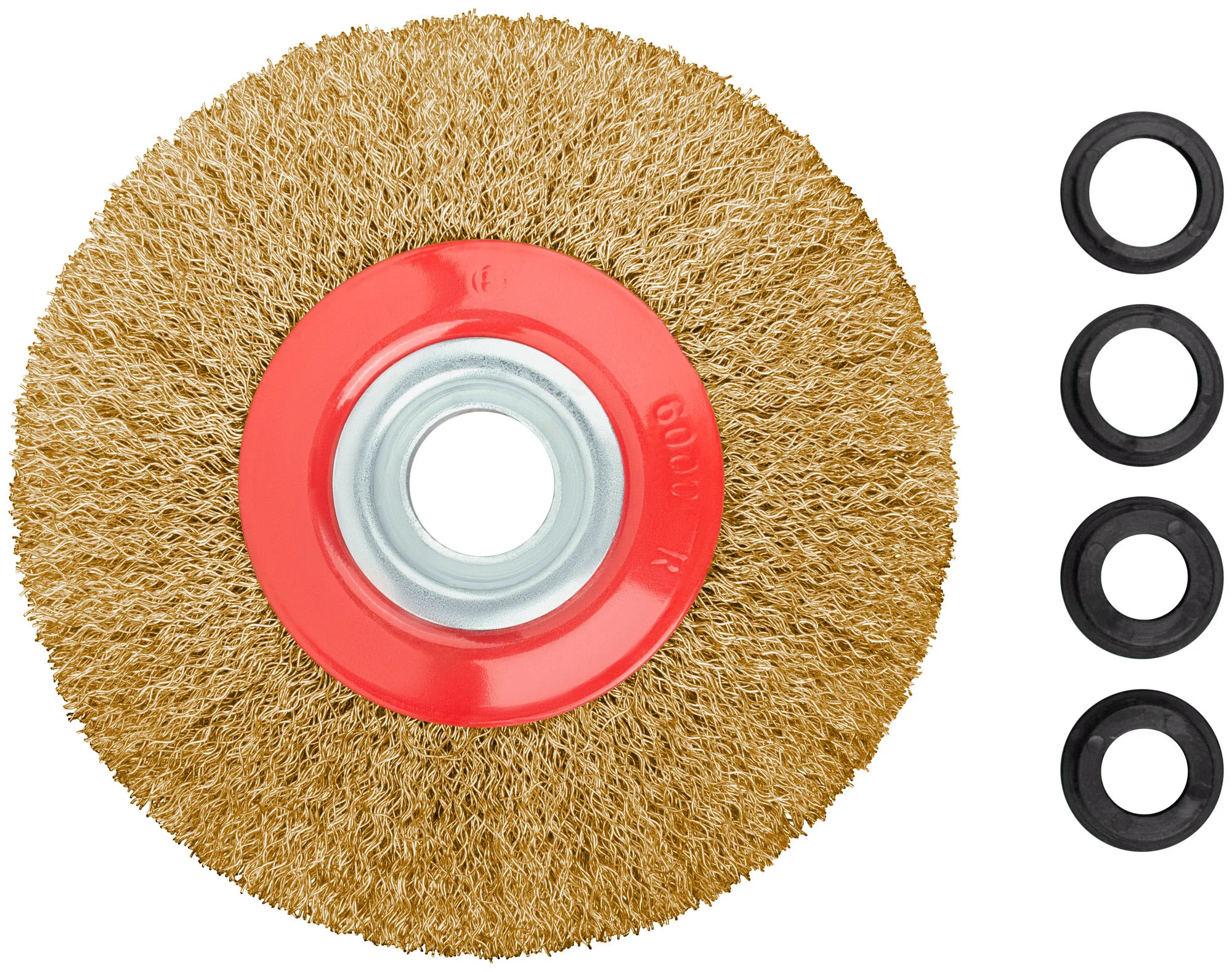 Изделие выполнено из стальной латунированной волнистой проволоки, что обеспечивает долговечность и высокую производительность. Корщетка комплектуется пластиковыми адаптерами, которые подходят для различных посадочных диаметров, что делает её универсальной в применении.