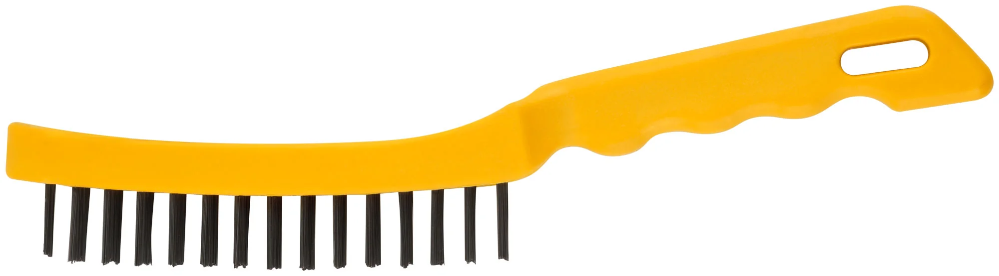 Корщетка оснащена желтой пластиковой ручкой, которая обеспечивает комфортный и надежный хват, а стальная щетина гарантирует долговечность и высокую эффективность работы. Инструментальная сталь делает щетку прочной и износостойкой.