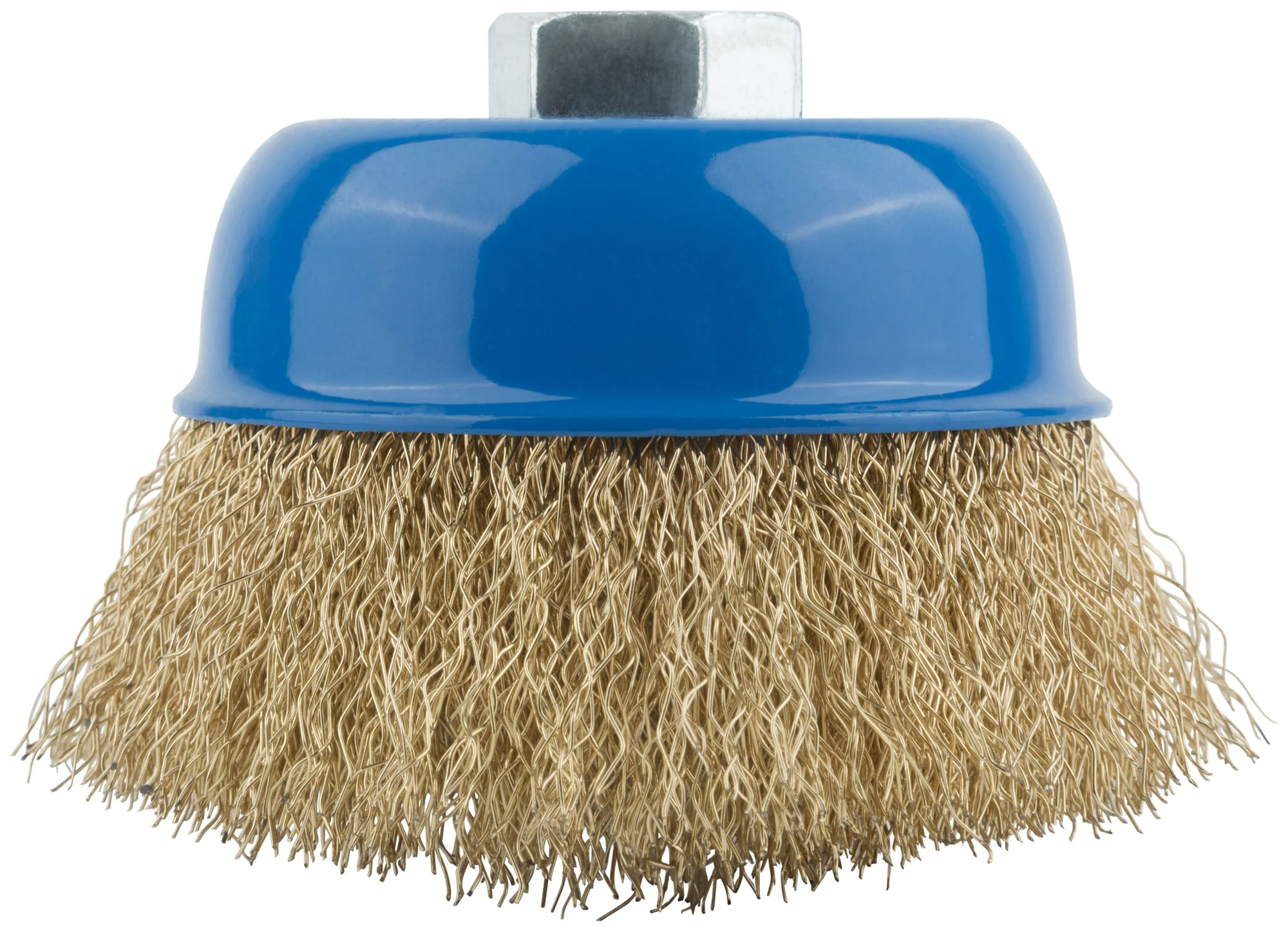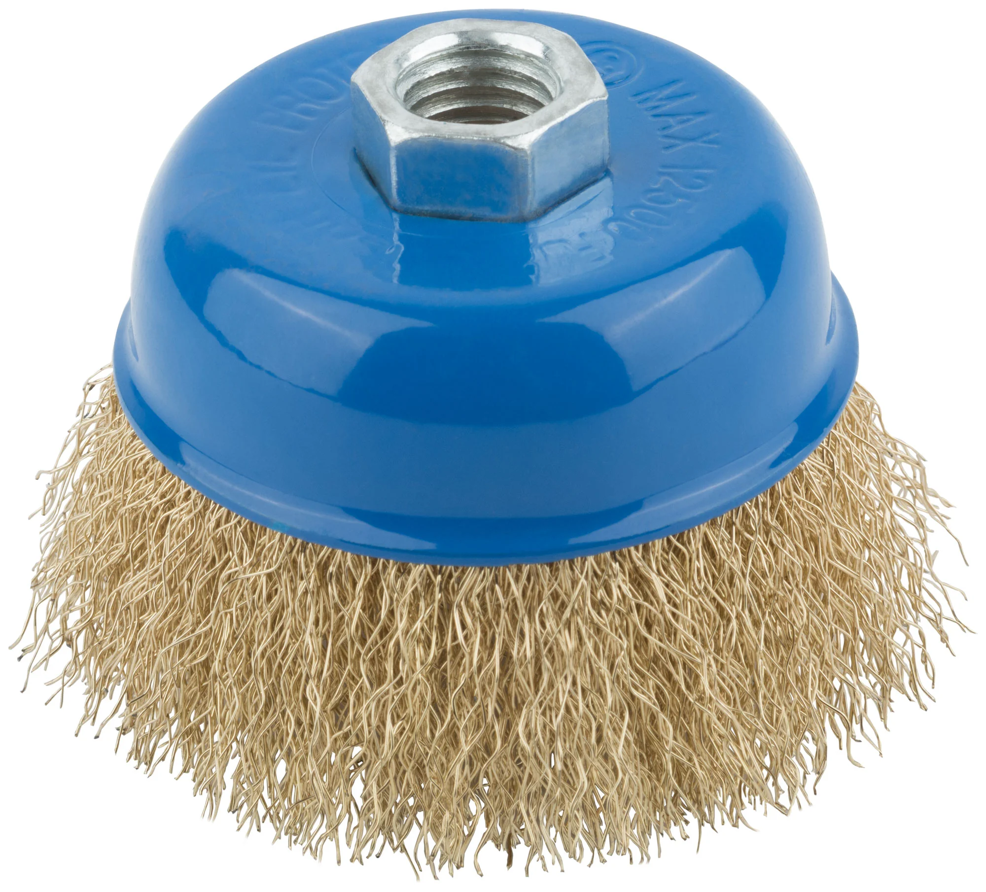 Корщетка выполнена в форме чашки и изготовлена из стальной латунированной волнистой проволоки. Это обеспечивает её долговечность и надёжную работу даже при интенсивной эксплуатации. Размер 75 мм позволяет обрабатывать как большие, так и труднодоступные участки.