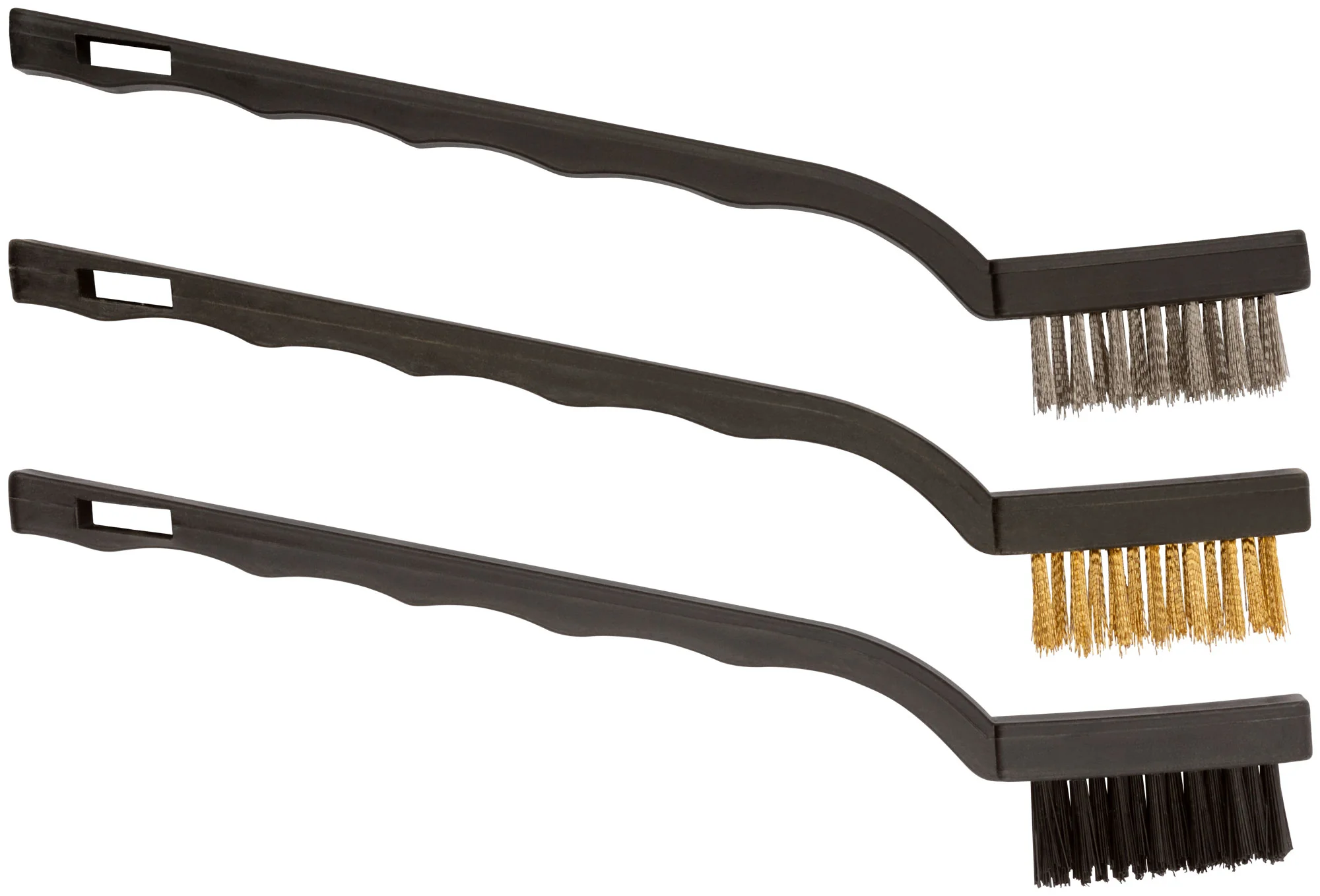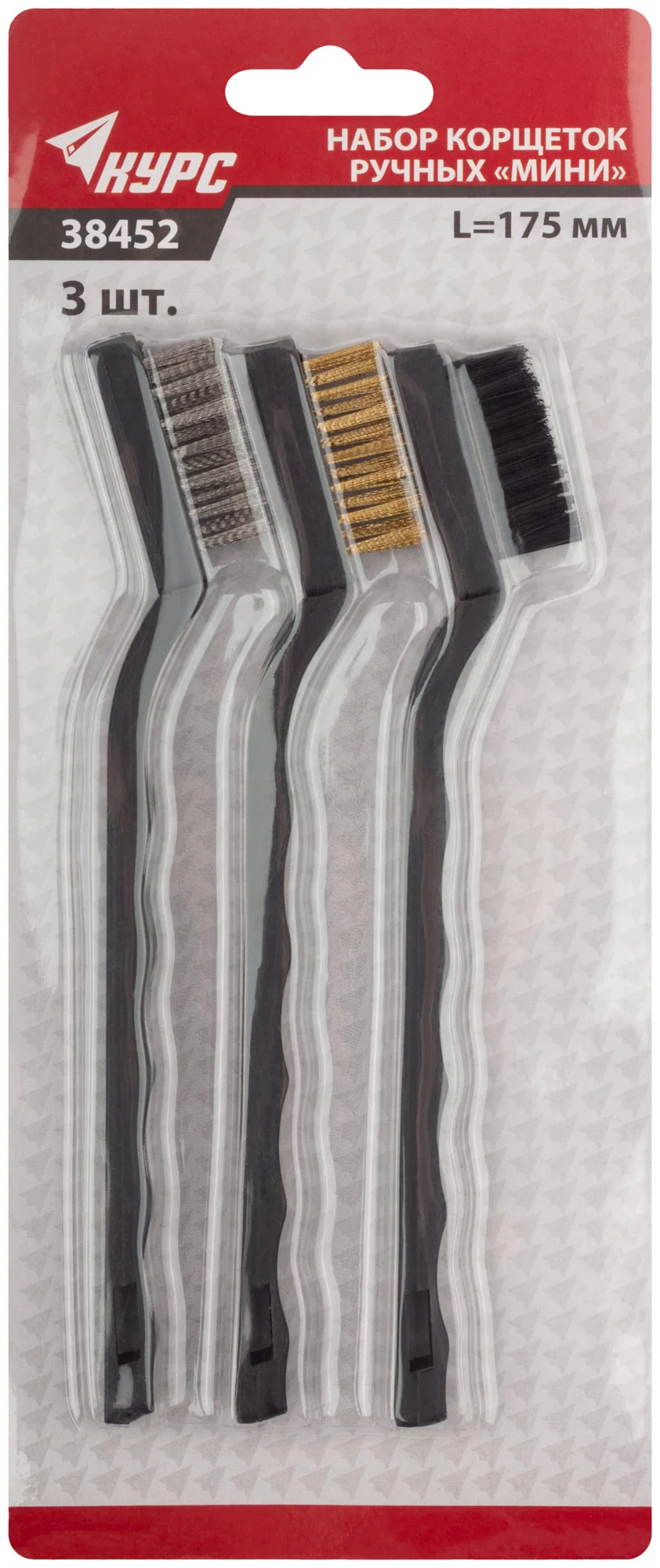 В комплект входят три корщетки из стали, нейлона и латуни, каждая из которых предназначена для работы с различными материалами. Длина каждой составляет 175 мм, что обеспечивает удобство работы в ограниченном пространстве.