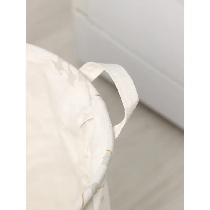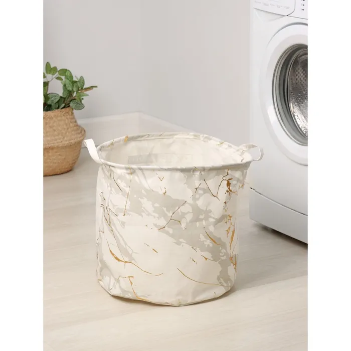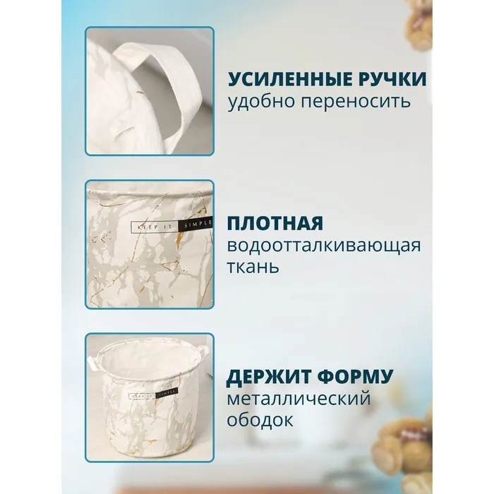 Выполнено из лёгкого текстильного материала.Удобная конструкция: в верхней окружности есть кольцо, которое добавляет жёсткости.Специальная водоотталкивающая пропитка надёжно защищает содержимое от попадания влаги.2 ручки для удобства переноски корзины.Оригинальный дизайн.Такие корзины можно использовать как для белья, так и для хранения домашних мелочей или детских игрушек.
