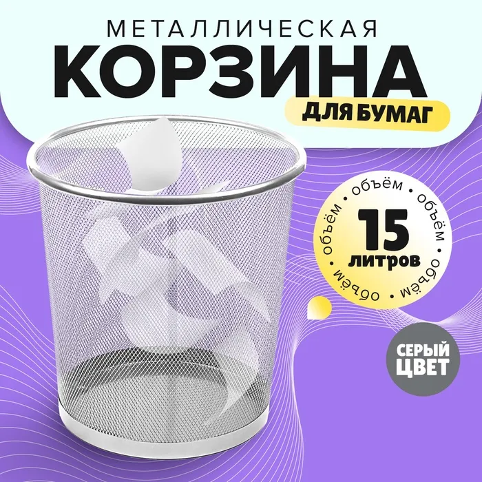 Корзина для бумаг, 15 литров, металлическая сетка, серая