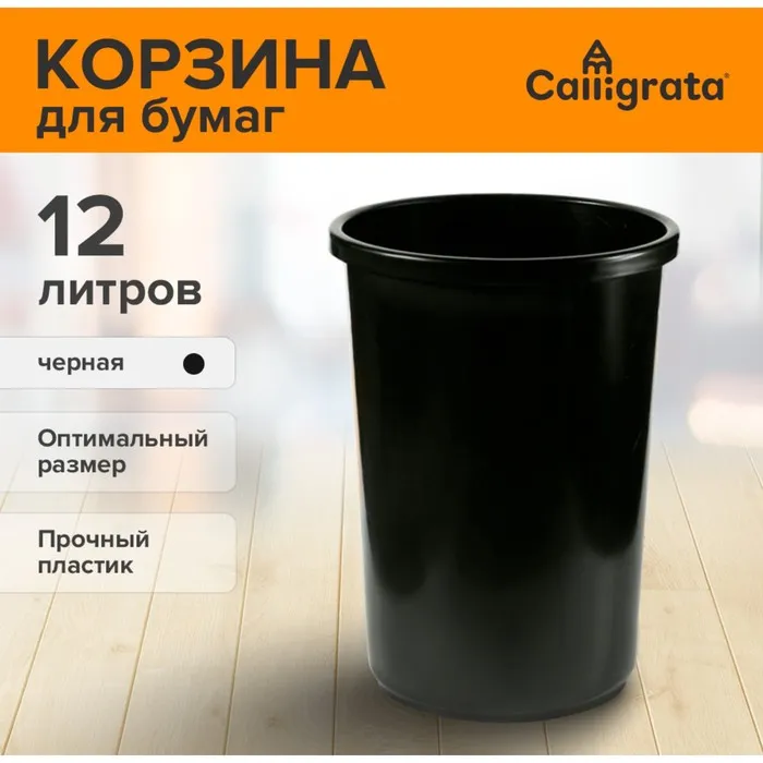 Корзина для бумаг и мусора Calligrata Uni, 12 литров, пластик, чёрная — Характеристики