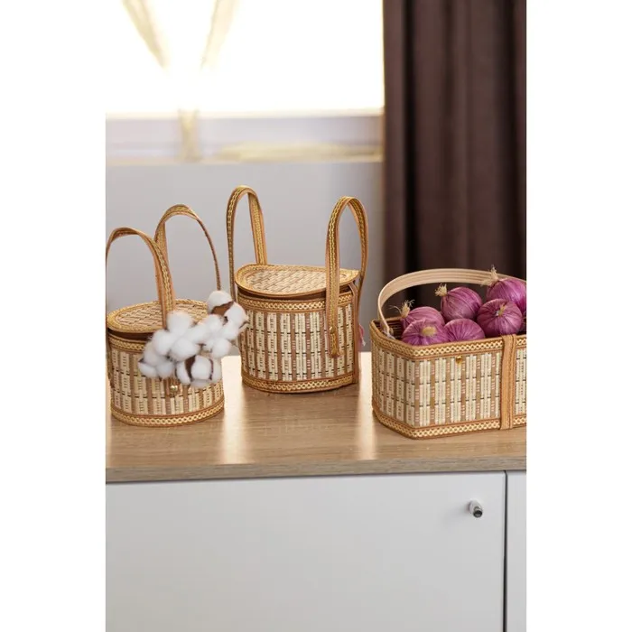 Круглая корзинка с крышкой из серии Nature — прекрасное решение для того, кто желает освежить облик своего жилища. Оцените, насколько к месту этот аксессуар может быть именно в вашем доме: