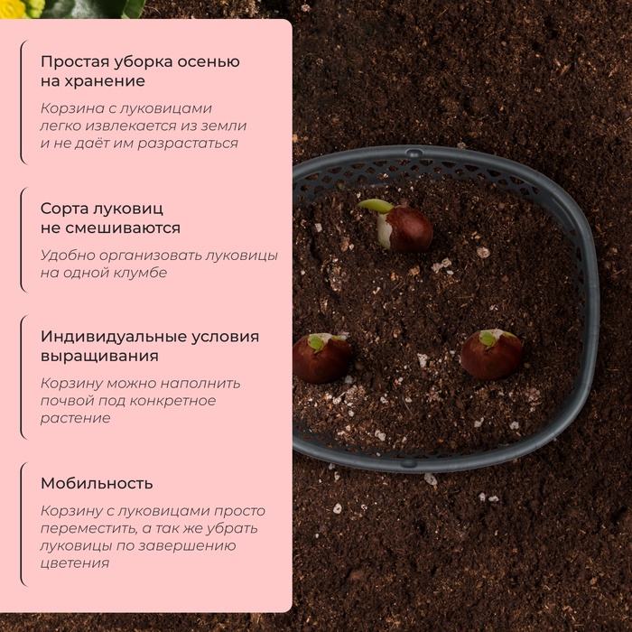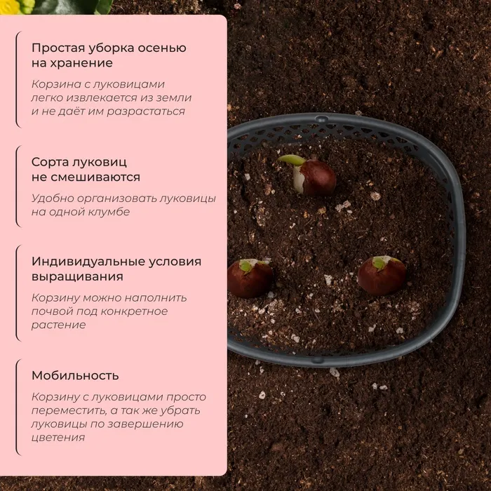 Корзина для посадки луковичных растений, овальная, 30.6×27 см, h=7.5 см, МИКС — Характеристики