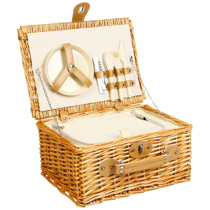 Корзина-холодильник для пикника с посудой — компактный и функциональный набор для отдыха на природе. Изделие плотно фиксируется специальными ремешками, есть встроенная термосумка для продуктов. Корзина выполнена из натуральной лозы и имеет древесную текстуру.