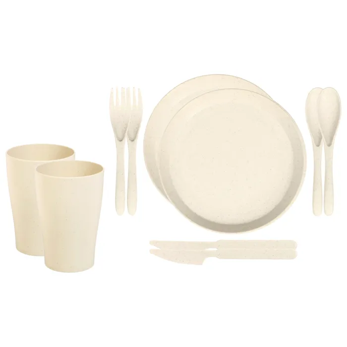 - Универсальный набор многоразовой посуды: ножи, вилки, ложки, тарелки, стаканы, штопор и салфетка.
