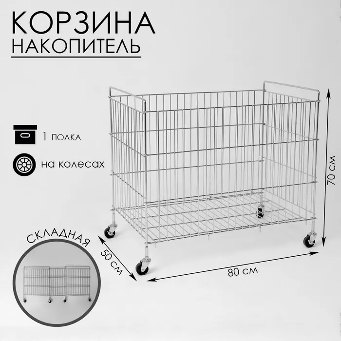 Корзина-накопитель складная на колесах, 1 полка, 50×80×70 см, цвет хром — это функциональное и удобное решение для хранения и организации пространства. Складная конструкция позволяет легко сложить корзину, когда она не используется, экономя место. Одной полки достаточно для хранения различных предметов, будь то одежда, игрушки или другие вещи.