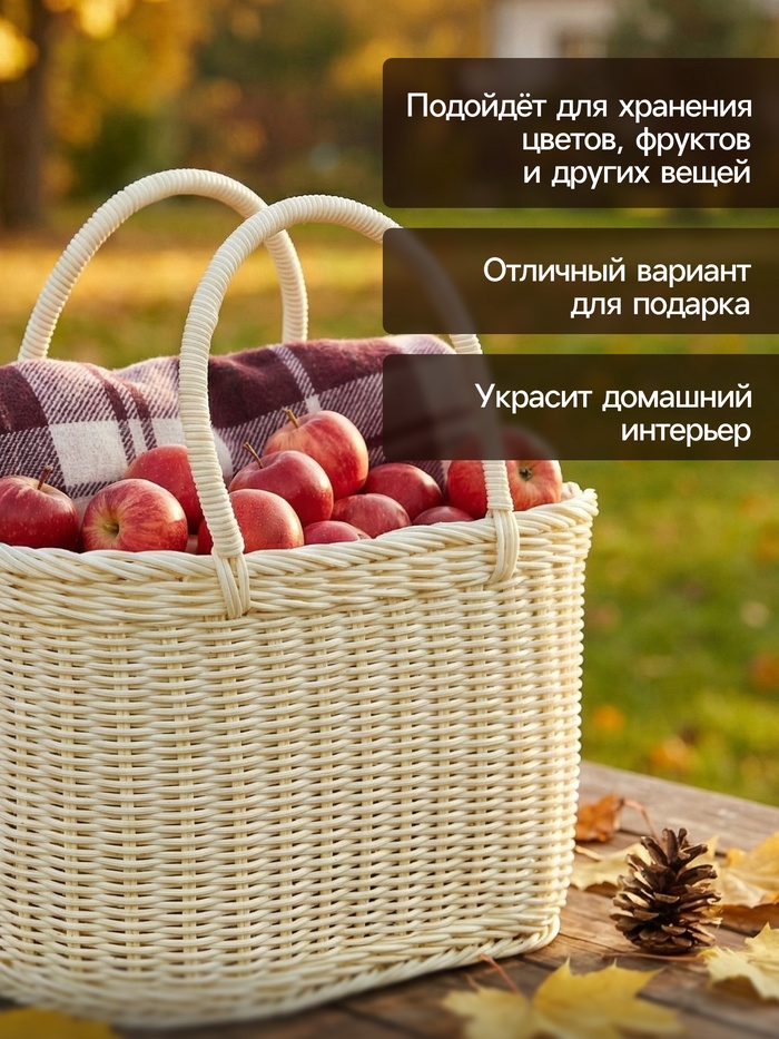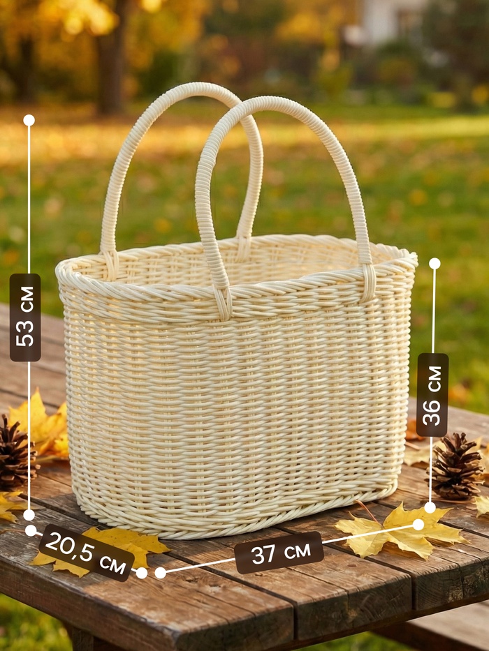 - Прочная комбинация материалов: пластиковое плетение сохраняет гибкость и устойчиво к влаге. Ручка высотой 17 см надёжно зафиксирована.