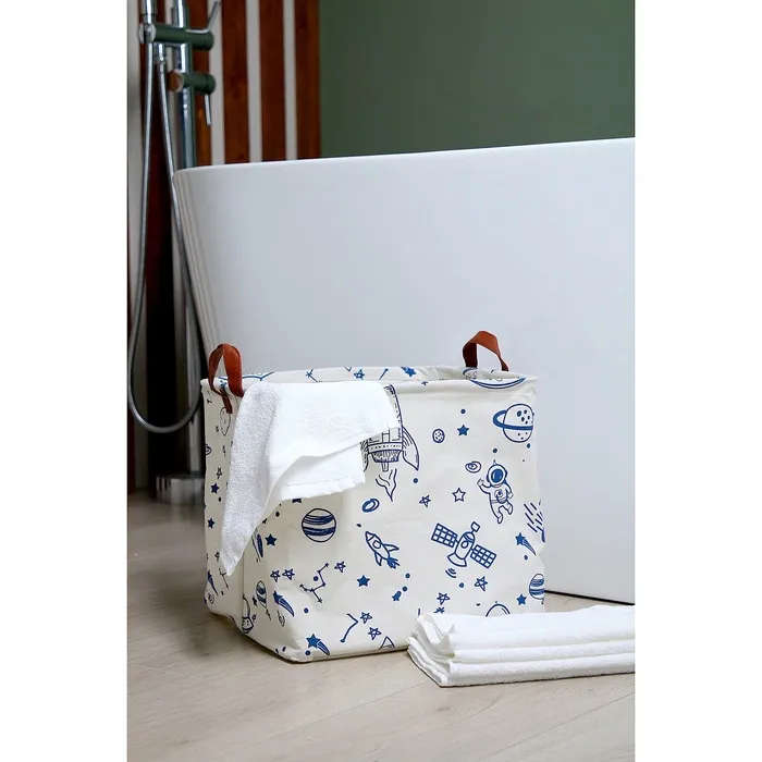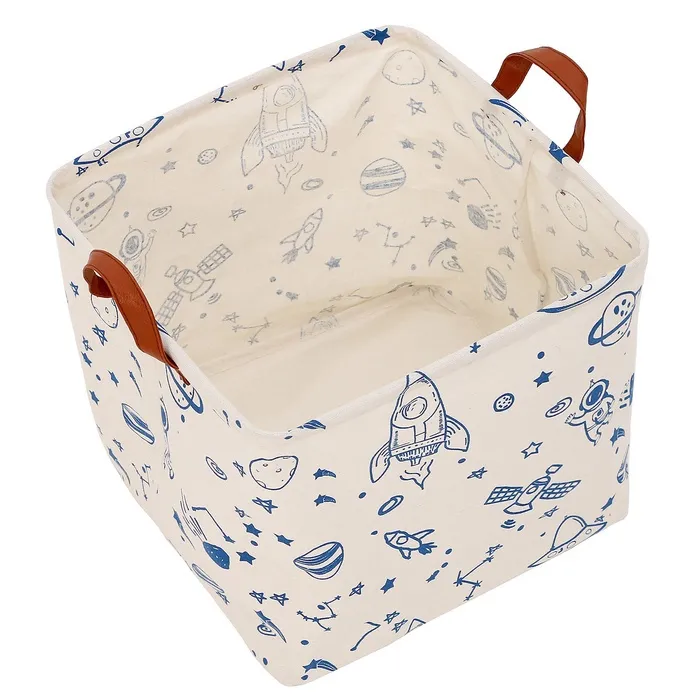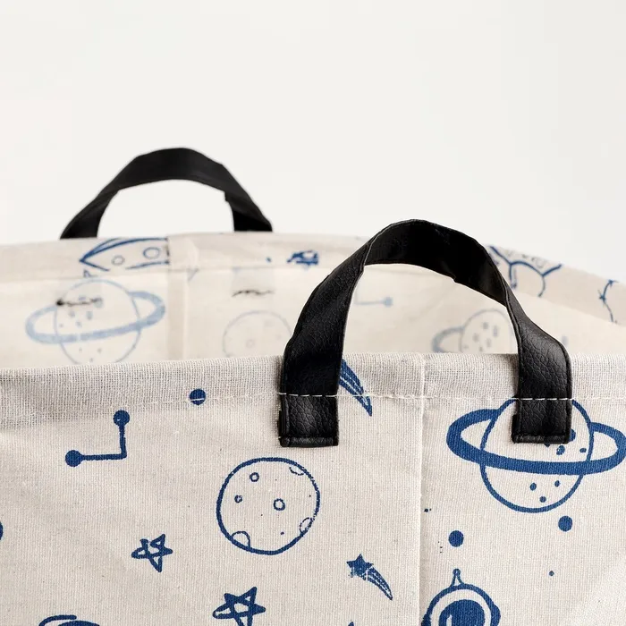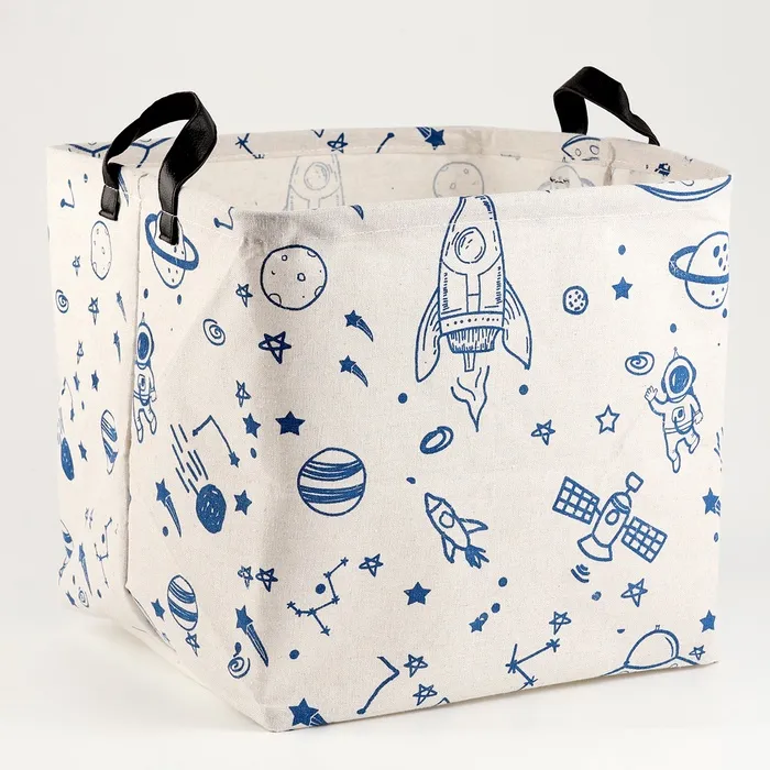 Эта корзина — не просто место для хранения, а элемент декора. Цветовая гамма сочетается с любым интерьером, а изображения космических объектов добавляют яркий акцент. Её можно использовать не только в детской комнате, но и в игровой зоне или даже в автомобиле, чтобы игрушки всегда были под рукой.
