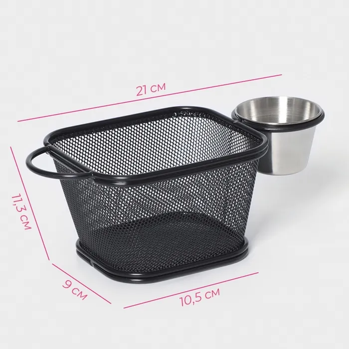 Эта корзинка выполнена в классическом чёрном цвете, который придаёт ей элегантный и современный вид. Прямоугольная форма позволяет рационально использовать пространство и удобно размещать её на столе. Соусник, входящий в комплект, идеально подходит для подачи соусов, дипов и других приправ, что делает сервировку ещё более удобной и привлекательной.