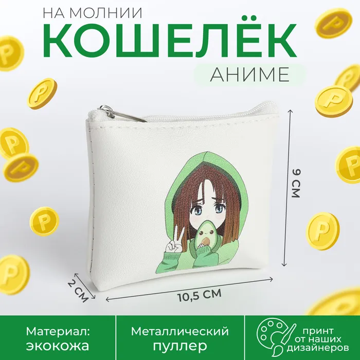 Кошелёк детский «Аниме avocado», монетница, на молнии, с рисунком, белый — Характеристики