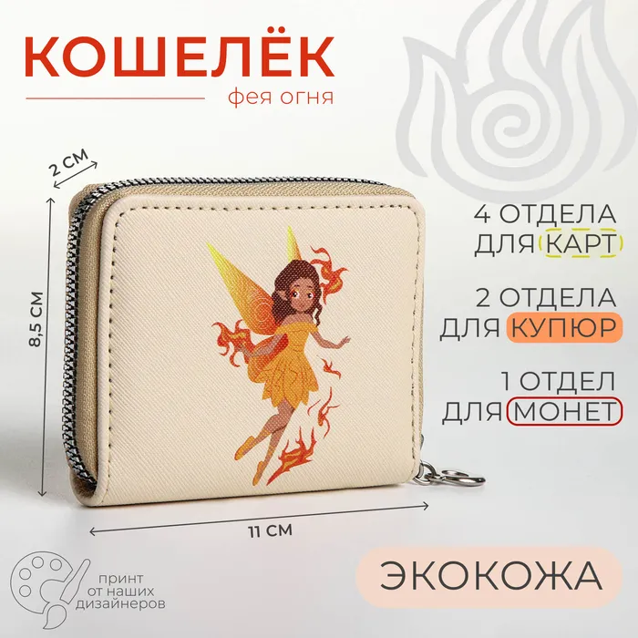Кошелёк на молнии «Фея огня», отдел для карт, для монет, бежевый — Характеристики