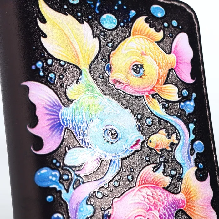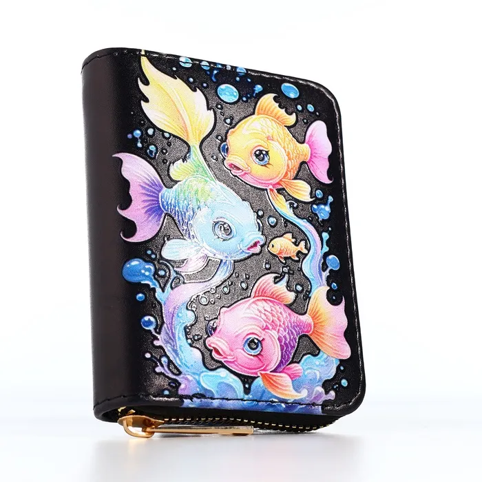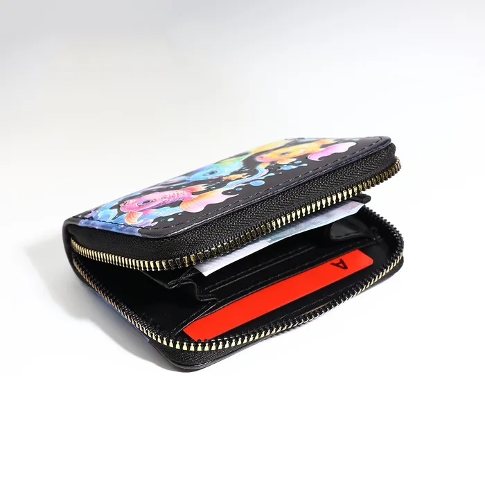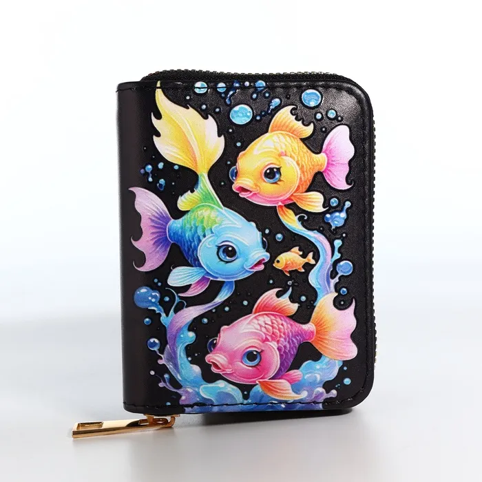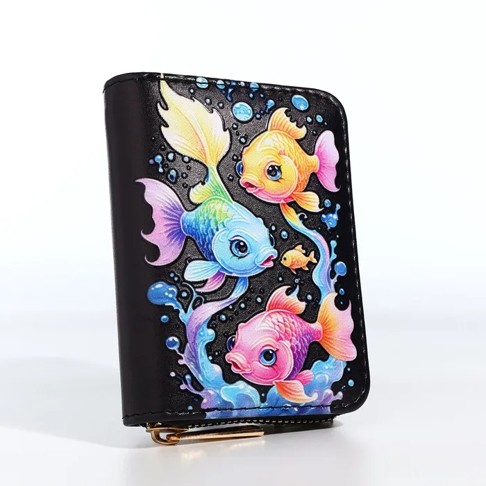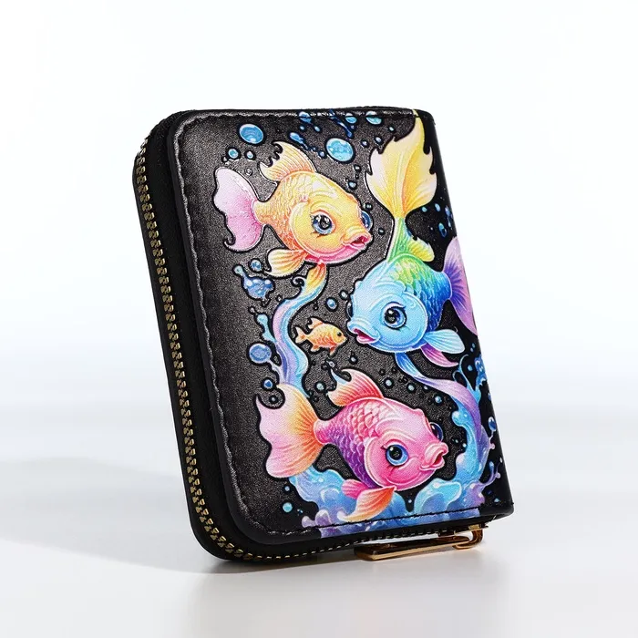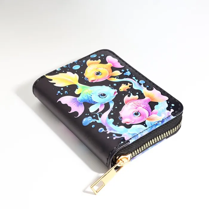 Этот чёрный кошелёк с загадочным морским миром станет элегантным спутником вашей дочки в её первых финансовых открытиях. Глубокий оттенок и таинственные обитатели океана создают стильный образ, а практичная организация внутреннего пространства помогает содержать карманные деньги в идеальном порядке. Компактный размер удобно ложится в детскую руку, становясь первым шагом к самостоятельности.