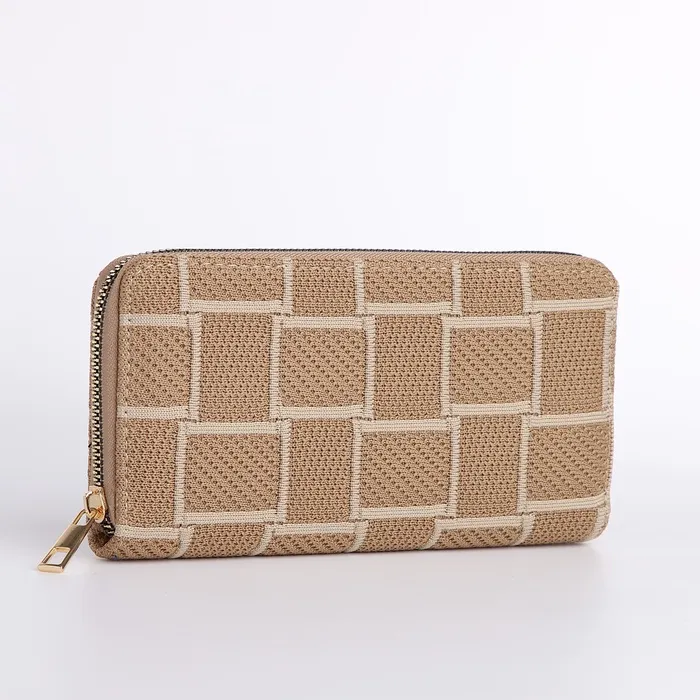 Этот бежевый кошелёк с геометрическим принтом сочетает нейтральную палитру с выразительной текстурой. Он подходит женщинам, которые предпочитают сдержанные оттенки, но ценят интересные детали. Клетчатый узор добавляет визуальный акцент, не нарушая гармонию базового гардероба.
