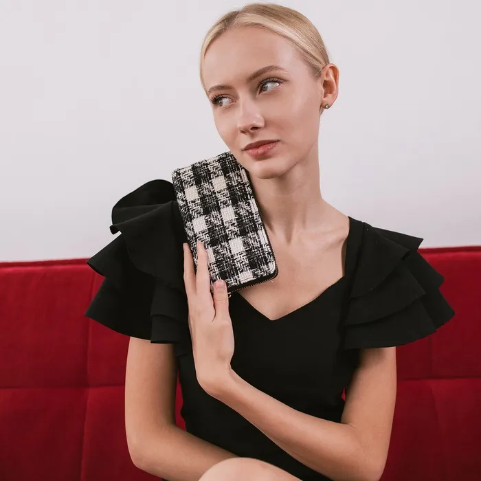 Этот чёрный кошелёк в клетку создан для женщин, ценящих классические узоры в повседневных аксессуарах. Он сочетает универсальность тёмного оттенка с узнаваемой текстурой, сохраняя практичную организацию пространства для хранения.